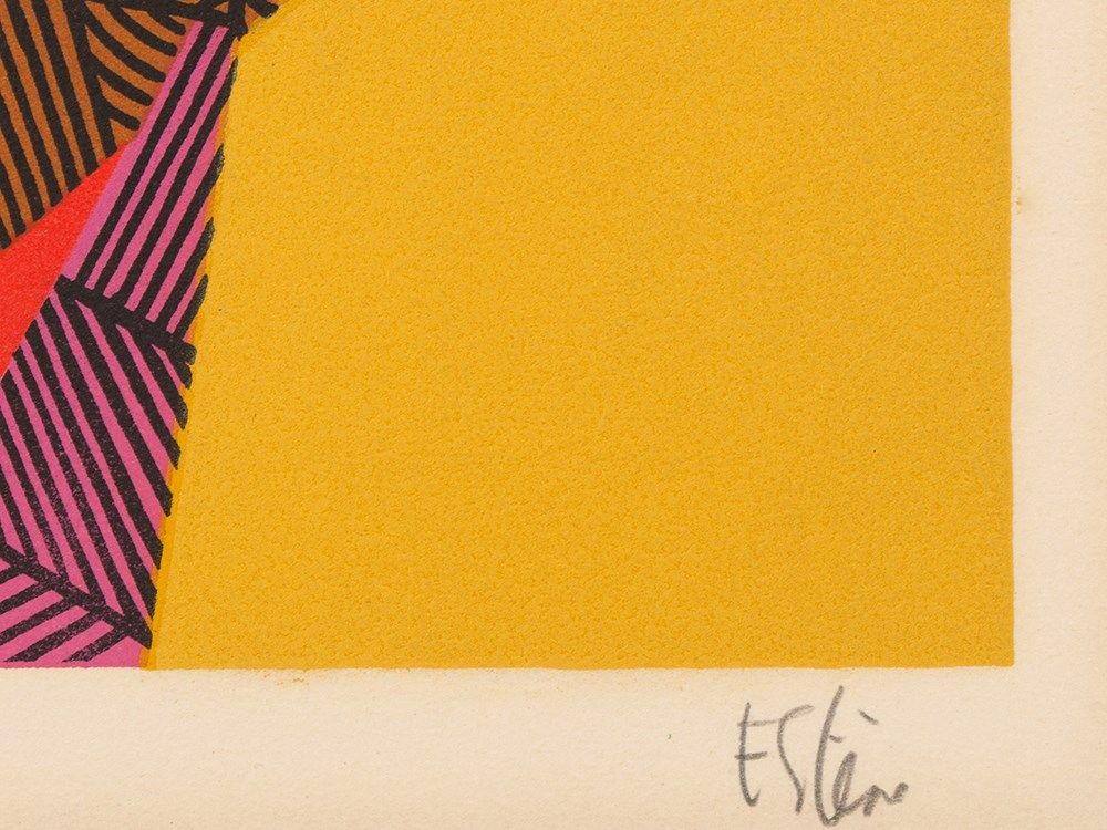 The lithograph in colors is signed lower right in pencil ‘Estève’ and numbered lower left in pencil ‘94/95’. The sheet is overall somewhat, partly stronger toned and darkened along the edges of the mat window. The margins are creased, lower left there is a faint scratch. The sheet is mounted to a passepartout at the reverse sheet edges. The frame indicates slight signs of wear. The image measures 65.4 x 50.1 cm, the sheet 78 x 59.7 cm. The framed dimensions are 87 x 69.2 cm.