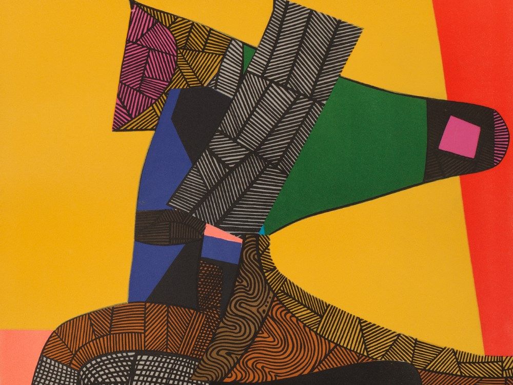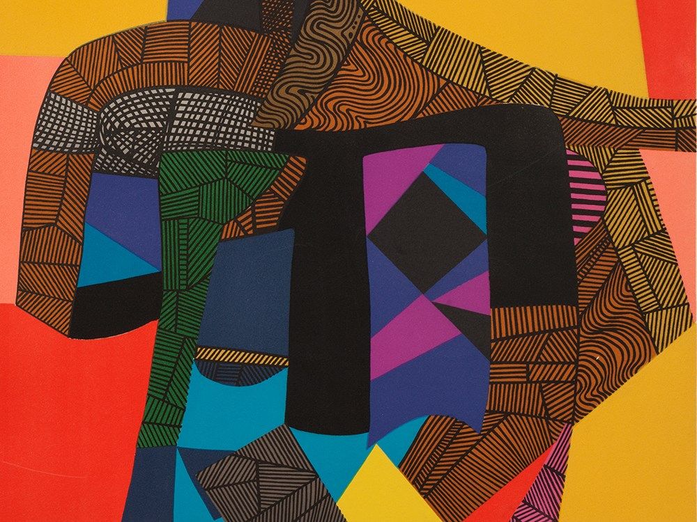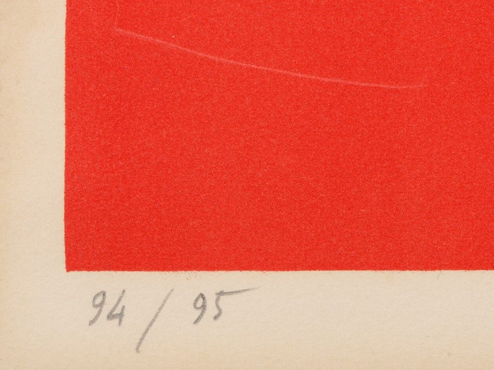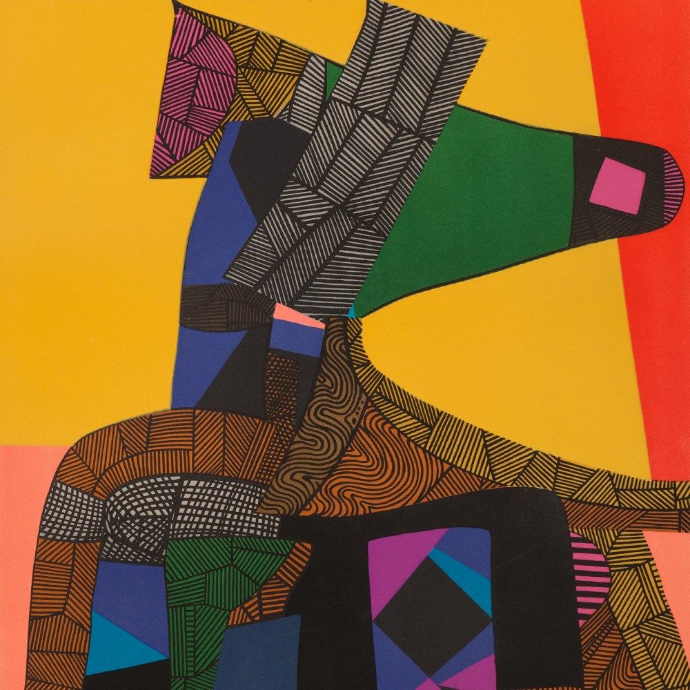 The very decorative and colorful lithograph was created in 1969. Abstracted composed from colorful and textured areas a standing dog-like figure can be seen. It is the eponymous ancient Egyptian god of the dead Anubis, who is usually depicted as a man with a dog or jackal head.