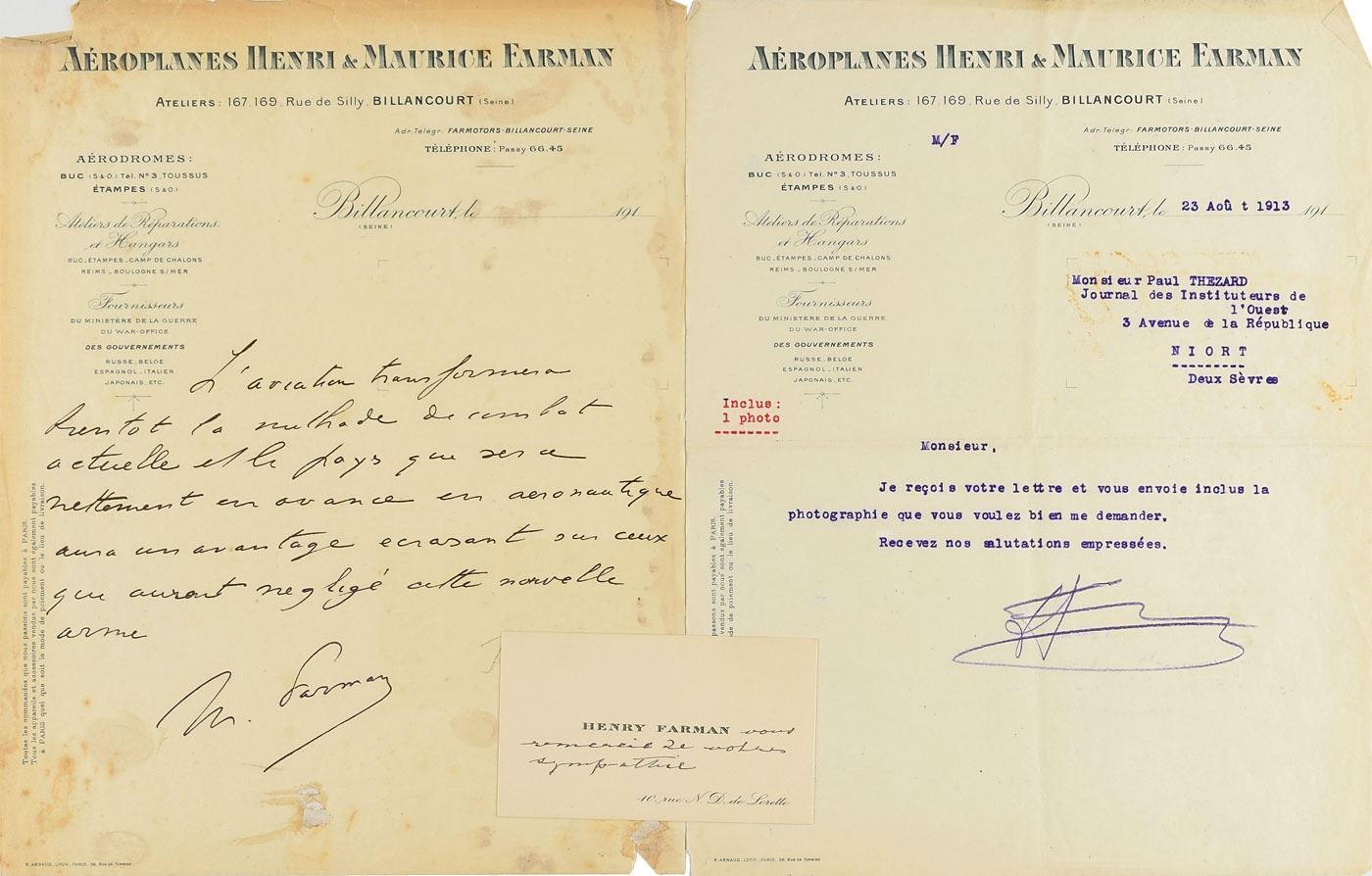 Anglo-French Grand Prix motor racing champion, aviator, and an aircraft manufacturer and designer (1877–1964). ALS in French, signed “M. Farman,” one page, 8.25 x 10.5, Aeroplanes Henri & Maurice Farman letterhead, no date. Visionary letter anticipating the significance of aviation in the future of warfare, in full (translated): "Aviation will soon change the way of fighting in the air, and the country who will be the Aeronautic Leader in using the aircraft as a weapon will have a high advantage on other countries." In very good to fine condition. Accompanied by the calling card of his brother Henri Farman, as well as a second typed letter on Aeroplanes Henri & Maurice Farman letterhead, dated August 23, 1913.