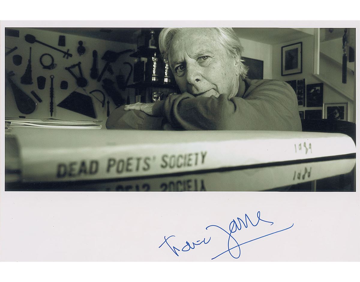 French composer of film scores (1924–2009), for which he won three Academy Awards. Glossy 11.75 x 8 photo of Barre leaning on a desk with the book Dead Poets Society in the foreground, signed in the lower border in blue ink. In fine condition.