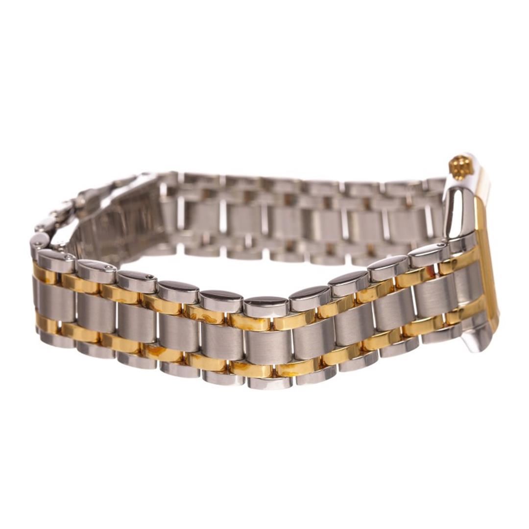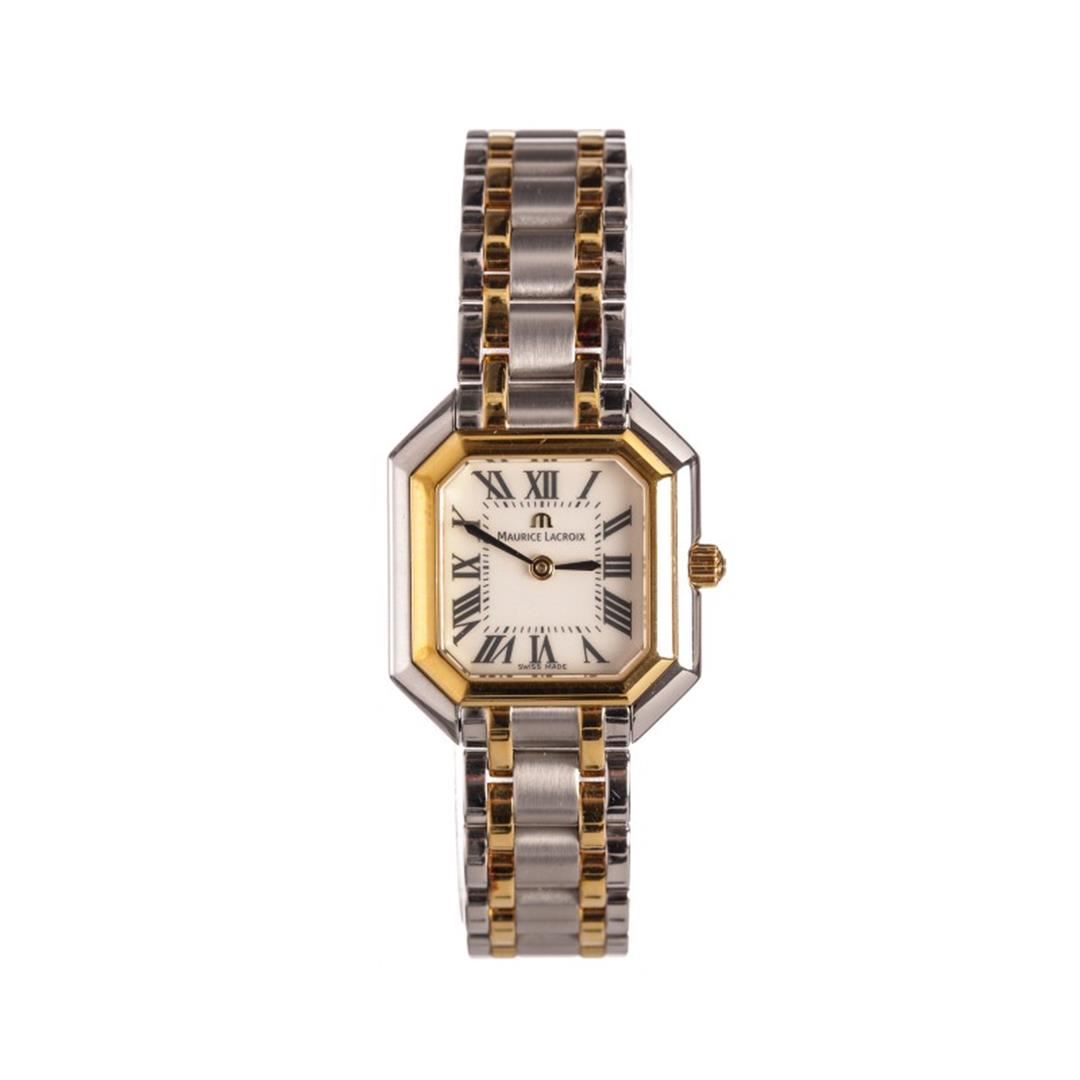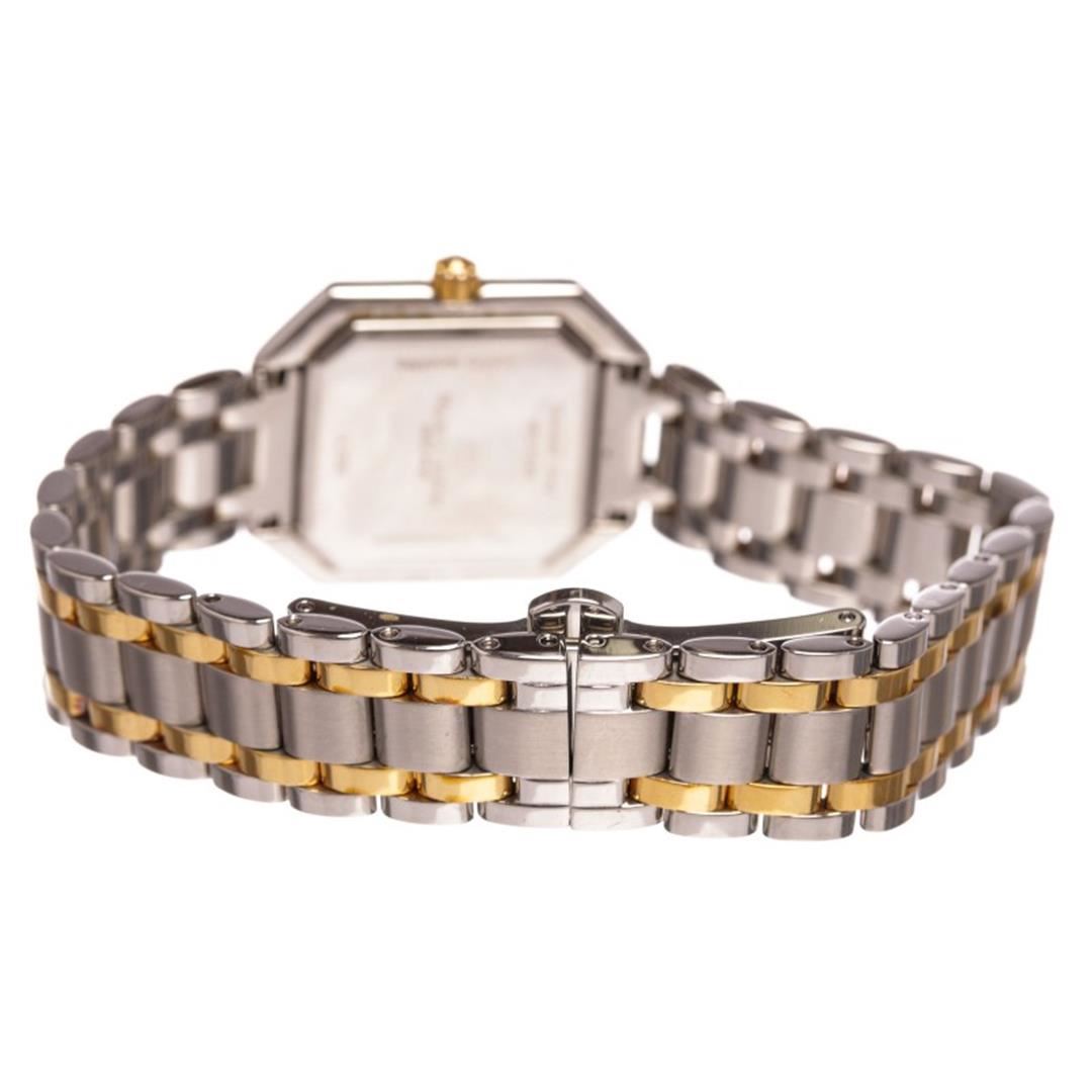 Steel and yellow metal this two tone women's wrist watch features a octagon face an a snap closure clasp. Item is pre-owned.
