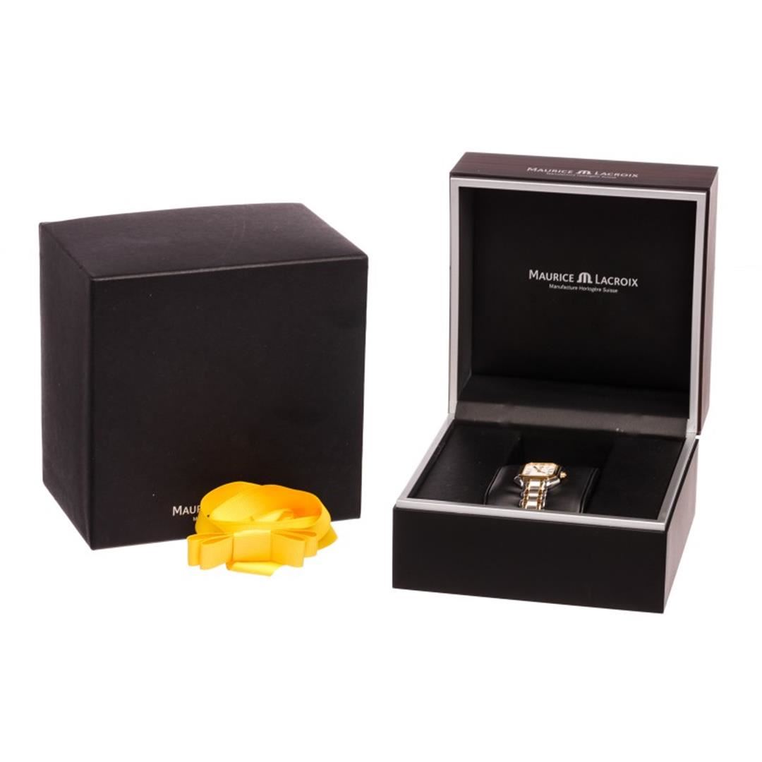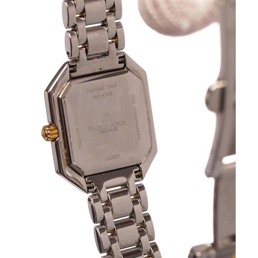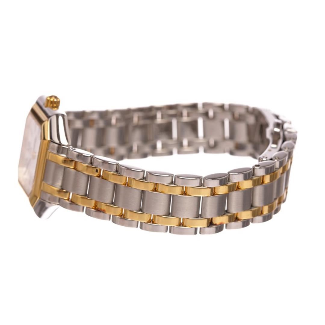 Steel and yellow metal this two tone women's wrist watch features a octagon face an a snap closure clasp. Item is pre-owned.