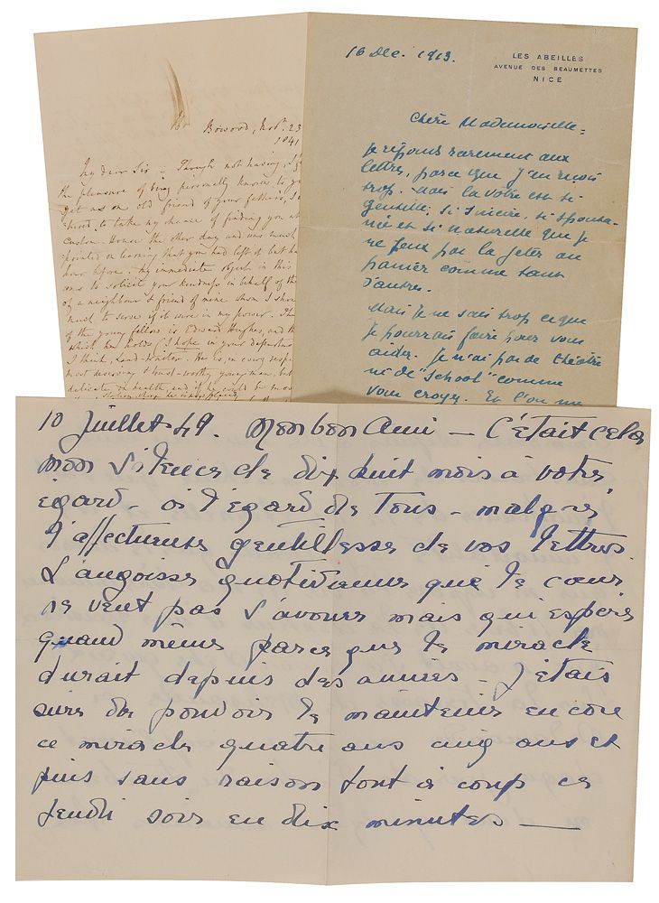 Maeterlinck (1862–1949) was a Belgian playwright awarded the Nobel Prize in Literature in 1911. Moore (1779–1852) was a famed Irish poet and songwriter best known for ‘The Last Rose of Summer.’ Three letters: one ALS, in French, signed “Maeterlinck,” two pages on adjoining sheets, 5.5 x 7, Les Abeilles letterhead, December 16, 1913, a letter to an admirer, in part (translated): “I don’t really know what I can do to help you. I have neither a theater nor a ‘school’ as you believe. And I’m rarely performed in France and England. Therefore what do you want me to do?…if you’re ever in Nice, come and see me. We’ll talk. We’ll examine the problem, and in any case, we’ll become good friends.”; one ALS signed “Thomas Moore,” one page both sides, 4.5 x 7.25, November 23, 1841, recommending that a neighbor’s position be moved to a seaport due to his delicate health; and an unsigned partial ALS from Maeterlinck’s widow, Renee Dahon, in French, four pages on two adjoining sheets, 5.5 x 8.25, July 10, 1949, expressing her grief after Maeterlinck’s death. In small part: “On the Terrace of Melisande at Orlamonde my eyes are filled with tears every day in the shadow of the tomb.” Maeterlinck letter in very good condition, with central vertical and horizontal folds, the vertical fold passing through a single letter of the signature, scattered creases, and overall toning; other letters in fine condition, with scattered toning and a couple brushes to ink.