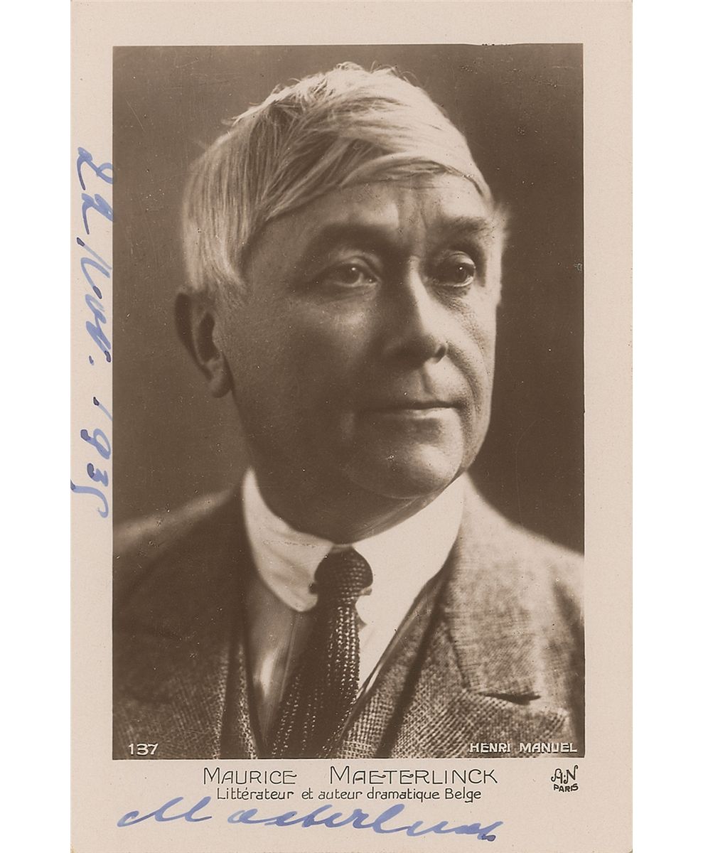 Belgian playwright, poet, and essayist (1862–1949) awarded the Nobel Prize in Literature in 1911. Choice matte-finish 3.75 x 5.5 postcard photo, signed in the lower border in fountain pen, “Maeterlinck,” and dated in the border, “22 Nov. 1935.” In fine condition. An uncommon example.