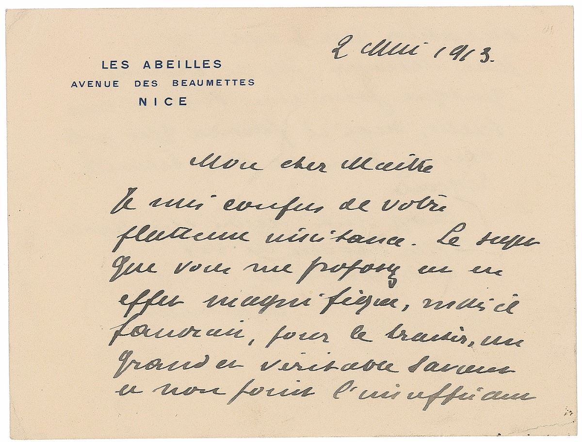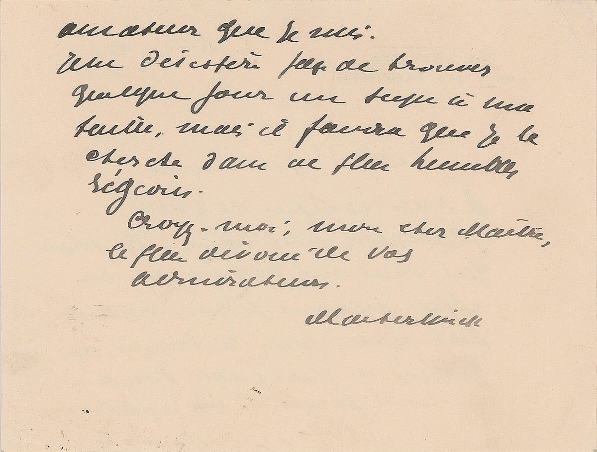 Belgian playwright, poet, and essayist (1862–1949) awarded the Nobel Prize in Literature in 1911. Untranslated ALS in French, signed “Maeterlinck,” one page both sides, 5.5 x 4.25, May 2, 1913. In fine condition.