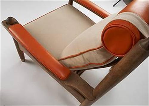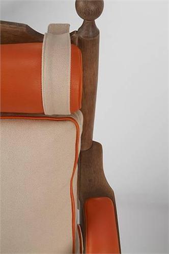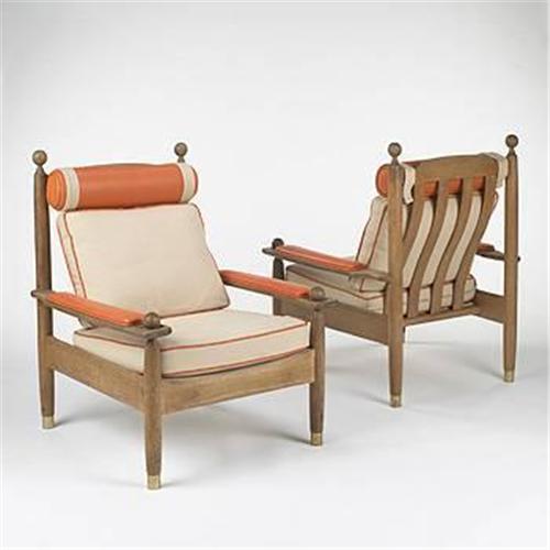 Maurice Pre<BR>chairs, pair<BR>France, c. 1945<BR>Hermes box leather and linen, oak, brass<BR>30.5"w x 32"d x 39"h<BR>Recovered in 2001 by Hermes with their house leather and linen. Sold with letter of authenticity from J. Donbon-Pokorny. Signature to base of one example: [Maurice Pre].<BR>Provenance: Madame Pokorny, Paris<BR>Private collection, Birmingham, Michigan<BR><BR><BR><BR>