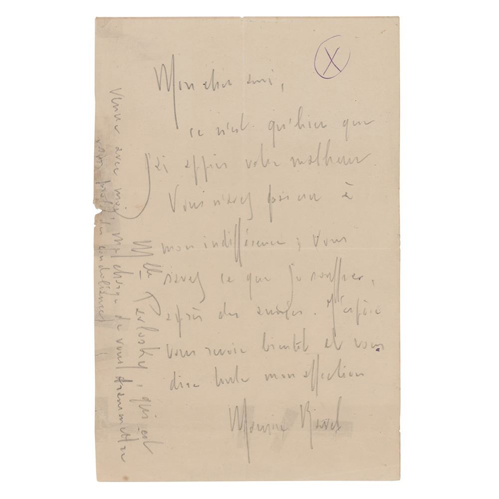 Scarce ALS in French, one page, 5.75 x 8.75, no date. Untranslated handwritten letter in pencil to a friend. In very good to fine condition, with show-through along the left edge, and behind the signature, from small pieces of old tape on the back.