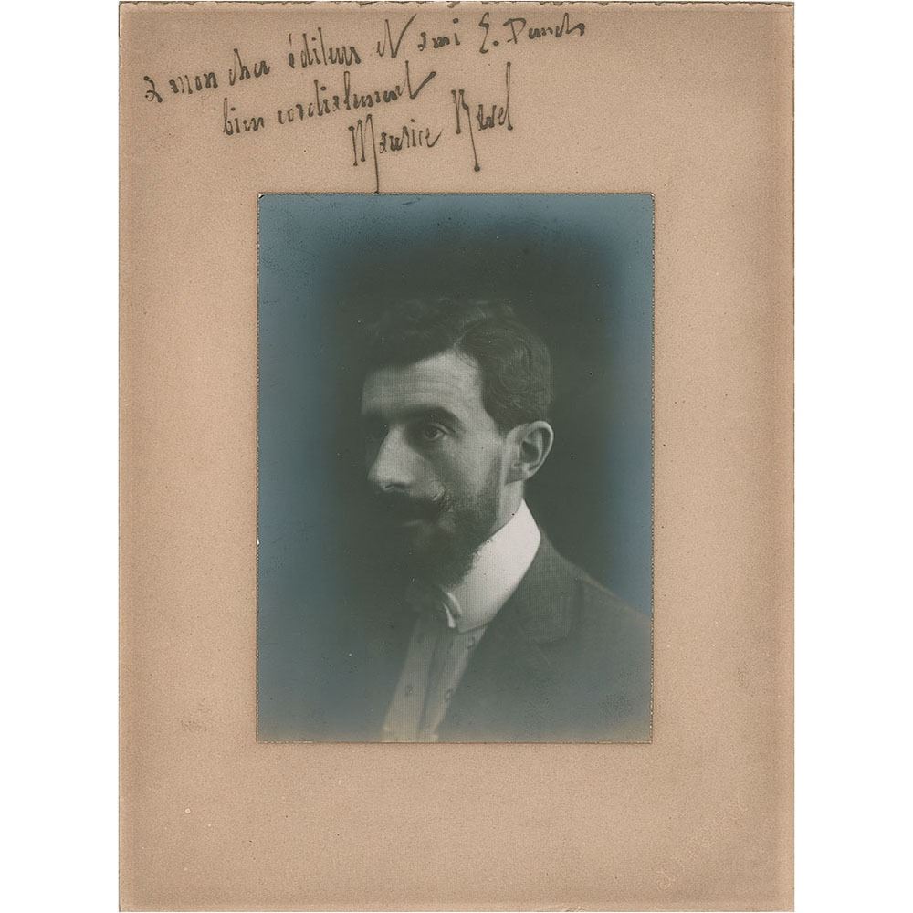 Vintage matte-finish 4 x 5.5 portrait of Ravel in a bust-length pose by J. Hery, affixed to the original 6.75 x 9 studio mount, signed and inscribed on the mount in bold ink to his editor, "A mon cher éditeur et ami, E. Demets, bien cordialement, Maurice Ravel.†In very good to fine condition, with toning and soiling to the mount, and light silvering to the perimeter of the portrait. One of the most prestigious music publishers in early 20th-century Paris, Eugene Demets worked with a number of well known modern composers, including Maurice Ravel, Erik Satie, and Joaquin Turina. Demets published Ravel's Pavane pour une infante défunte in 1900, Jeux d'eau in 1902, and Miroirs in 1906.