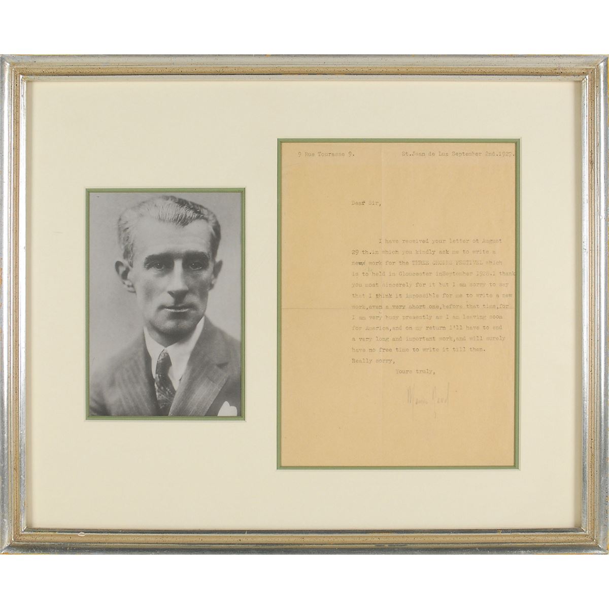 TLS, one page, 7 x 9.75, September 2, 1927. Letter to an inquiring fan, in part: “I have received your letter ot [sic] August 29th. in which you kindly ask me to write a new work for the THREE CHOIRS FESTIVEL [sic] which is to be held in Gloucester in September 1928. I thank you most sincerely for it but I am sorry to say that I think it impossible for me to write a new work, even a very short one, before that time, for I am very busy presently as I am leaving soon for America, and on my return I’ll have to end a very long and important work, and will surely have no free time to write it till then.” Double-matted and framed with a head-and-shoulders image of Ravel to an overall size of 18.5 x 15. In fine condition, with vertical and horizontal folds, uniform toning, and light scattered creasing. After touring the United States and Canada from January to April of 1928, Ravel fulfilled a promise to the famed Russian actress and dancer Ida Rubinstein by finishing a previously commissioned ballet. The result was Bolero, Ravel’s most famous musical composition, which premiered at the Paris Opera in November, 1928.