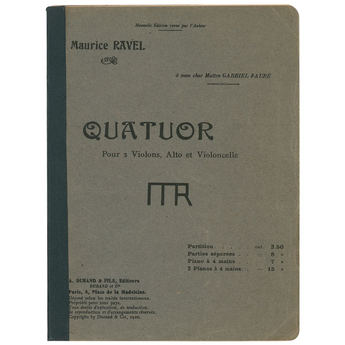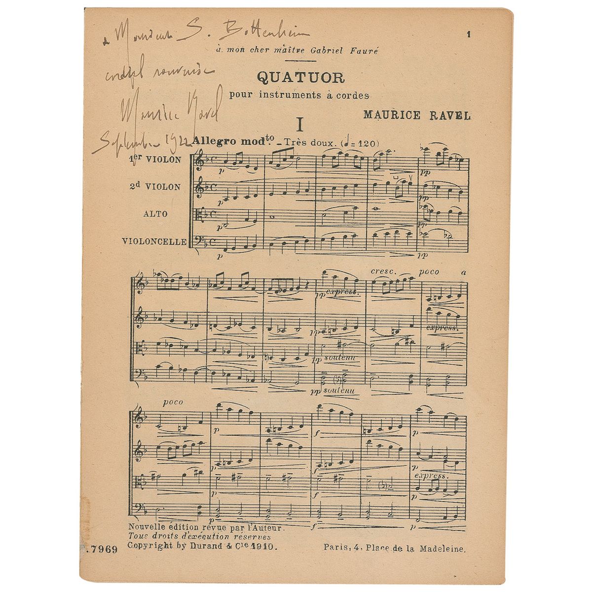 Highly influential French composer (1875–1937) who remains unsurpassed in his imaginative use of instrumental color in his operas, brilliantly scored orchestral music, and virtuosic piano pieces. Printed and bound score to Ravel’s only string quartet, ‘Quatuor,’ 5.5 x 7.5, 47 pages. Signed and inscribed, in French, to noted Dutch author and musicologist Salomon Bottenheim, on the first page of music and dated, “To Monsieur S. Bottenheim, Cordial souvenir, Maurice Ravel, September 1922.” Mild toning to inside pages, scattered light creasing and wear to covers, and small pencil notation to an opening page, otherwise fine condition. Accompanied by an original unsigned glossy 2.5 x 4.5 photo of Ravel sitting in his garden.