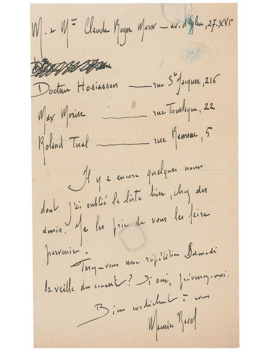 ALS in French, one page, 4.75 x 8, no date. Letter to Mr. and Mrs. Claude Roger Marx (playwright). Ravel provides the street address of “Dr. Hosiasson” (painter), “Max Morise” (surrealist writer, artist), and “Roland Tual” (film director, producer). Ravel adds: “There are a few more names…I’ll have them sent to you. Do you have a rehearsal Saturday, on the eve of the concert? If so, let me know.” In very good condition, with repairs to a couple small areas of paper loss, a few creases, and scattered toning.