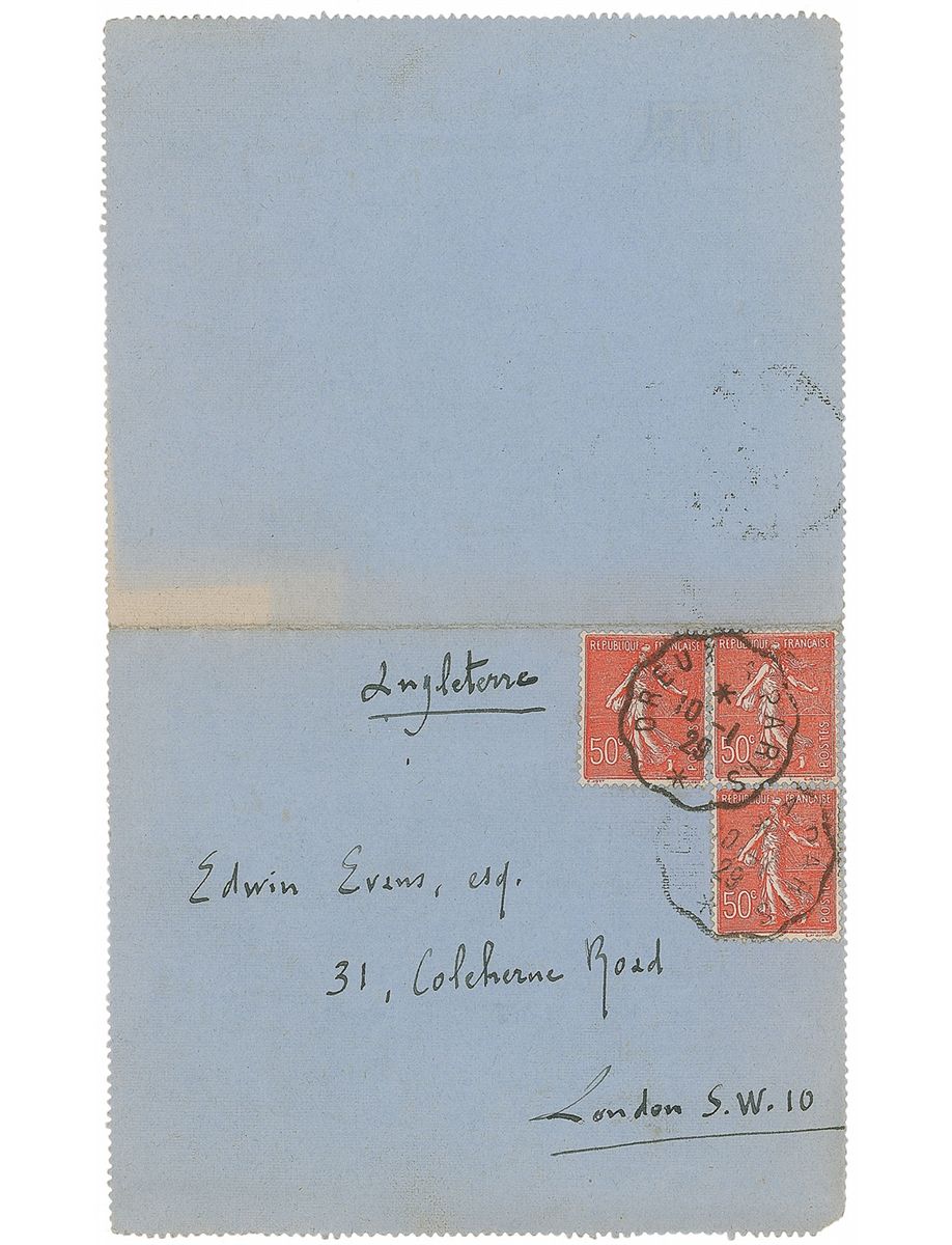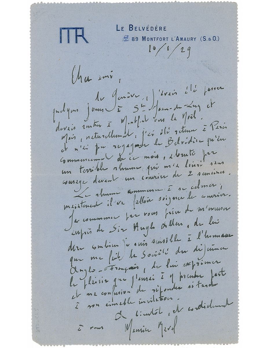 Highly influential French composer (1875–1937) who remains unsurpassed in his imaginative use of instrumental color in his operas, brilliantly scored orchestral music, and virtuosic piano pieces. Boldly penned ALS in French, one page, 4.5 x 7.5, personal Le Belvedere letterhead, January 10, 1929. Letter to his friend, English music critic Edwin Evans, asking him to relay a message to Sir Hugh Allen, “to tell him how much I appreciate the honor done me at the Anglo-French Luncheon Club,” to which he accepts the invitation. Also addressed on the reverse in Ravel’s hand. In fine condition. This luncheon was held in honor of Ravel two weeks later on January 24 at the the Princes' Restaurant in London, and was presided over by Sir Hugh Allen, the director of the Royal College of Music. Ravel’s iconic work, Bolero, had premiered two months earlier at the Paris Opera.
