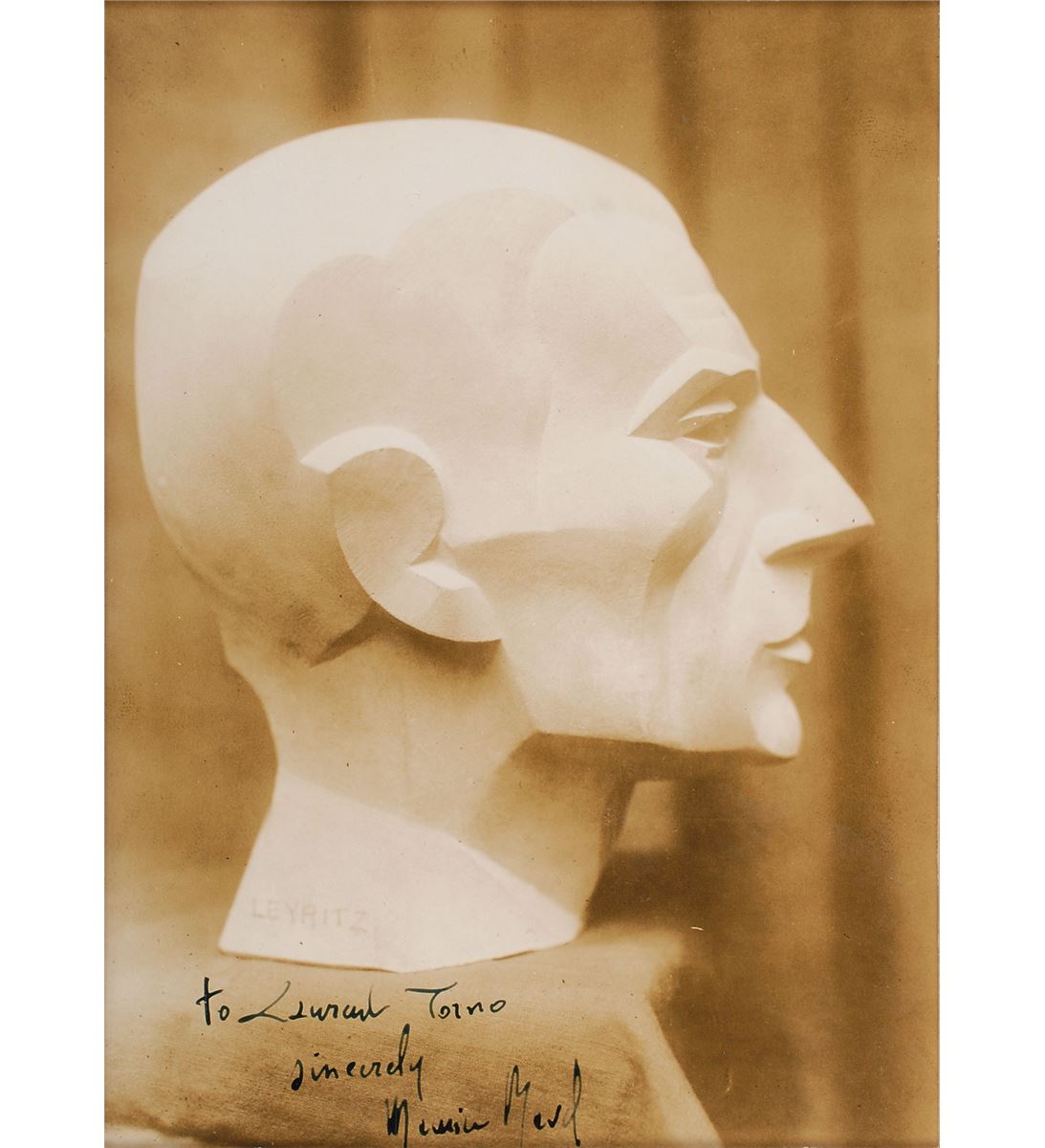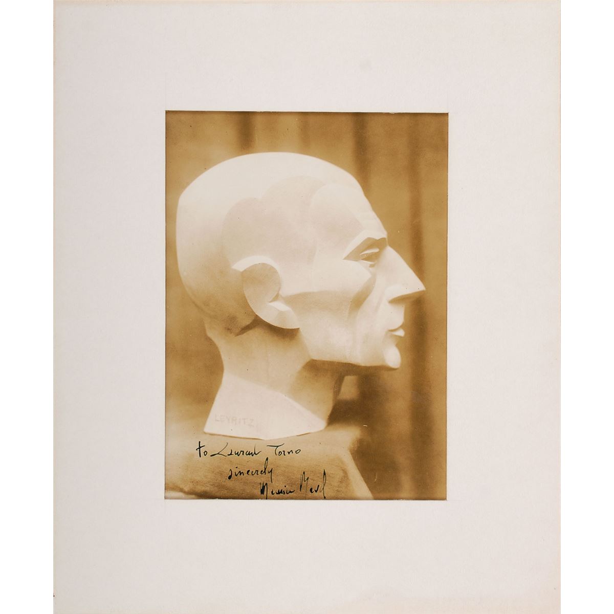 Rare pearl-finish 5.5 x 7.5 photo of sculptor Leon Leyritz’s Art Deco bust of Ravel, signed and inscribed in fountain pen to a flautist in the Cleveland Orchestra, “To Laurent Torno, sincerely, Maurice Ravel.” A pencil notation on the reverse of the mat reads, “1928, Ravel conducted Cleveland Symphony while I was a member, acted as his interpreter.” Matted to an overall size of 10 x 12. In fine condition. Ravel considered the Leyritz bust his best portrait, and Torno was later first flute with the St. Louis Symphony for several years—an excellent musical association.
