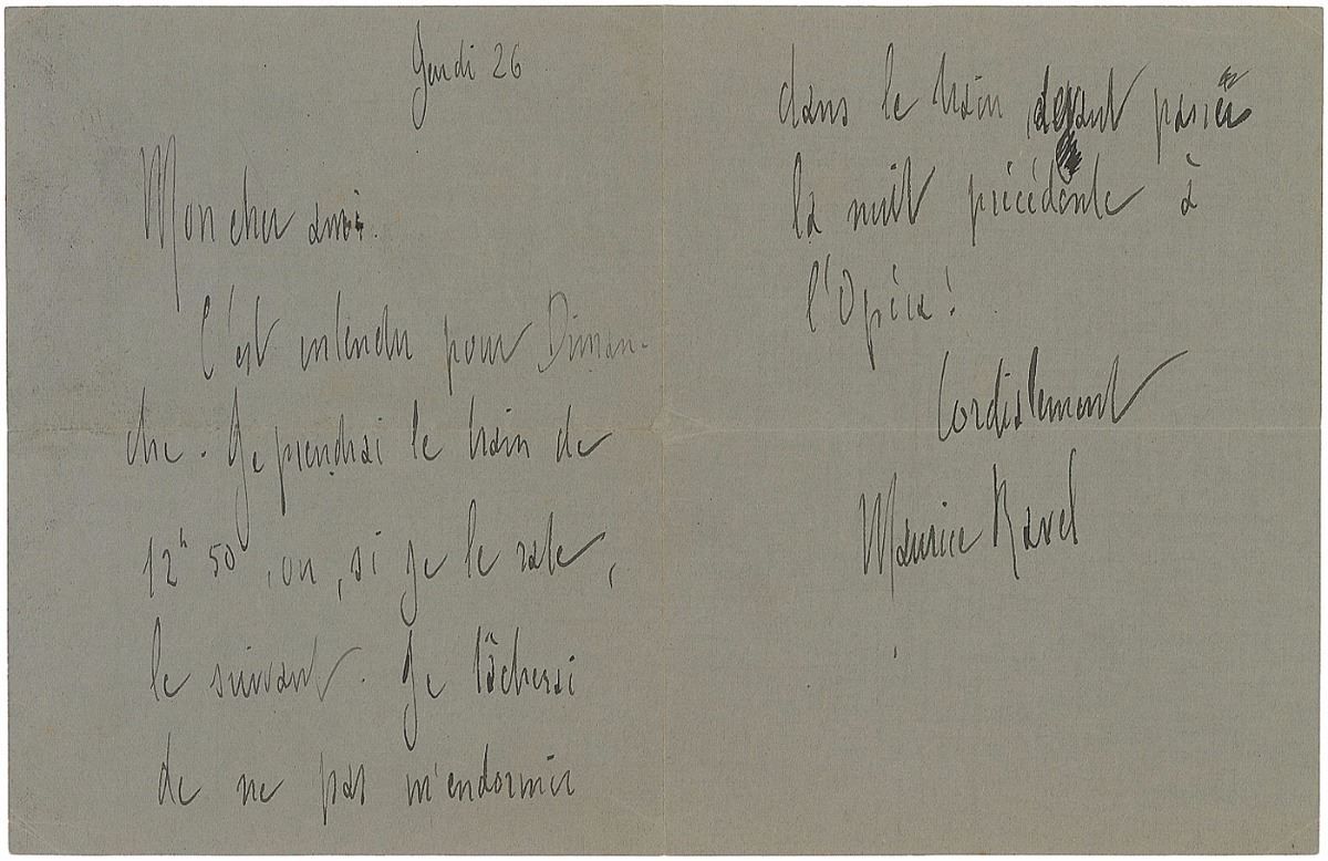 Desirable ALS in French, two pages on two adjoining sheets, 4.5 x 6, no date. Ravel accepts an invitation for the following Saturday, hoping that, due to a visit to the opera the preceding night, he will not fall asleep on the train. In fine condition, with light scattered soiling.