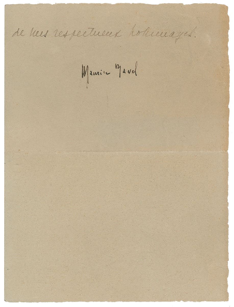 LS in French, two pages on two adjoining sheets, 5.25 x 7, La Floride letterhead, July 29, 1933. Letter declining a proposal for work, citing his declining health. In very good to fine condition, with paper loss to corners of the first page.
