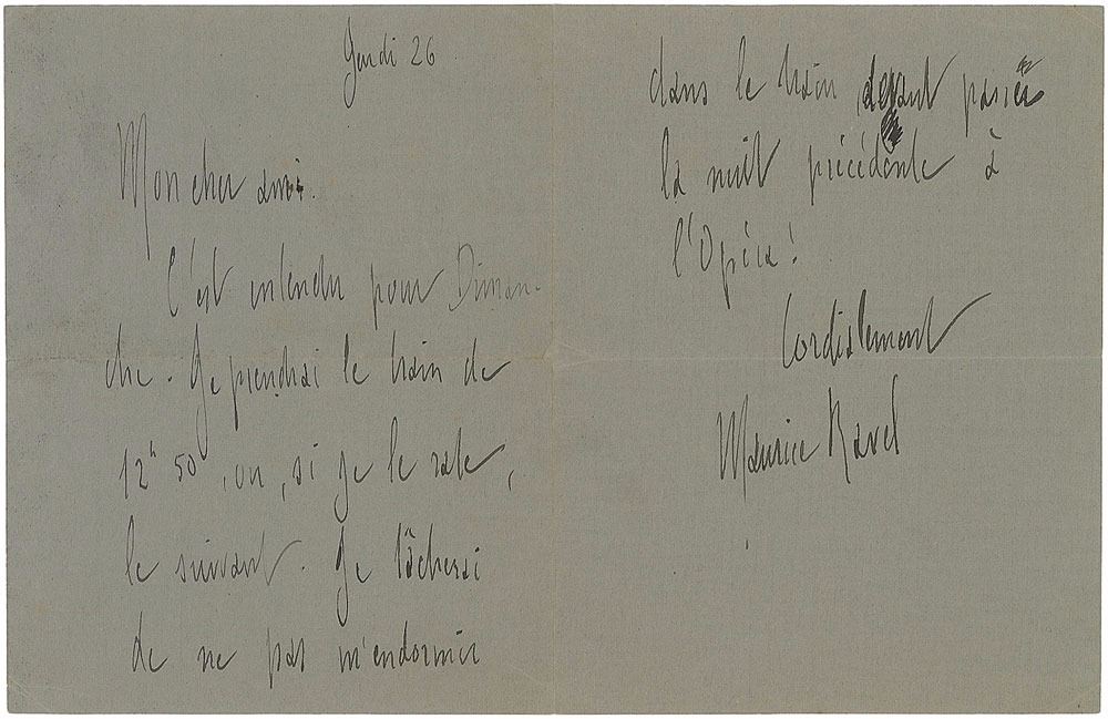 Highly influential French composer (1875-1937) who remains unsurpassed in his imaginative use of instrumental color in his operas, brilliantly scored orchestral music, and virtuosic piano pieces. Desirable ALS in French, two pages on two adjoining sheets, 4.5 x 6, no date. Ravel accepts an invitation for the following Saturday, hoping that, due to a visit to the opera the preceding night, he will not fall asleep on the train. In fine condition, with light scattered soiling.