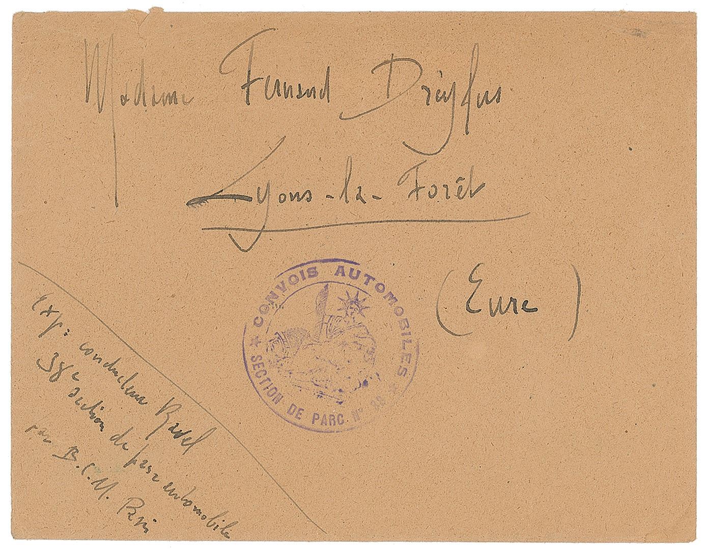 Mailing envelope, 5.75 x 4.5, addressed in Ravel's hand to "Madame Fernand Dreyfus, Lyons-la-Foret, (Eure)," and signed in the return address area in the lower left, "Exp: conducteur Ravel, 38e section de pare automobile par B.C.M., Paris." The front panel bears a purple ink stamp of the Automobile Convoys, and the reverse bears an August 1920 postmark. In very good to fine condition, with scattered light creasing and short tear to the top edge. Mme Fernand Dreyfus was the mother of Roland-Manuel, who was Ravel's close friend and pupil. This dates to WWI, during which Ravel served as a lorry driver.
