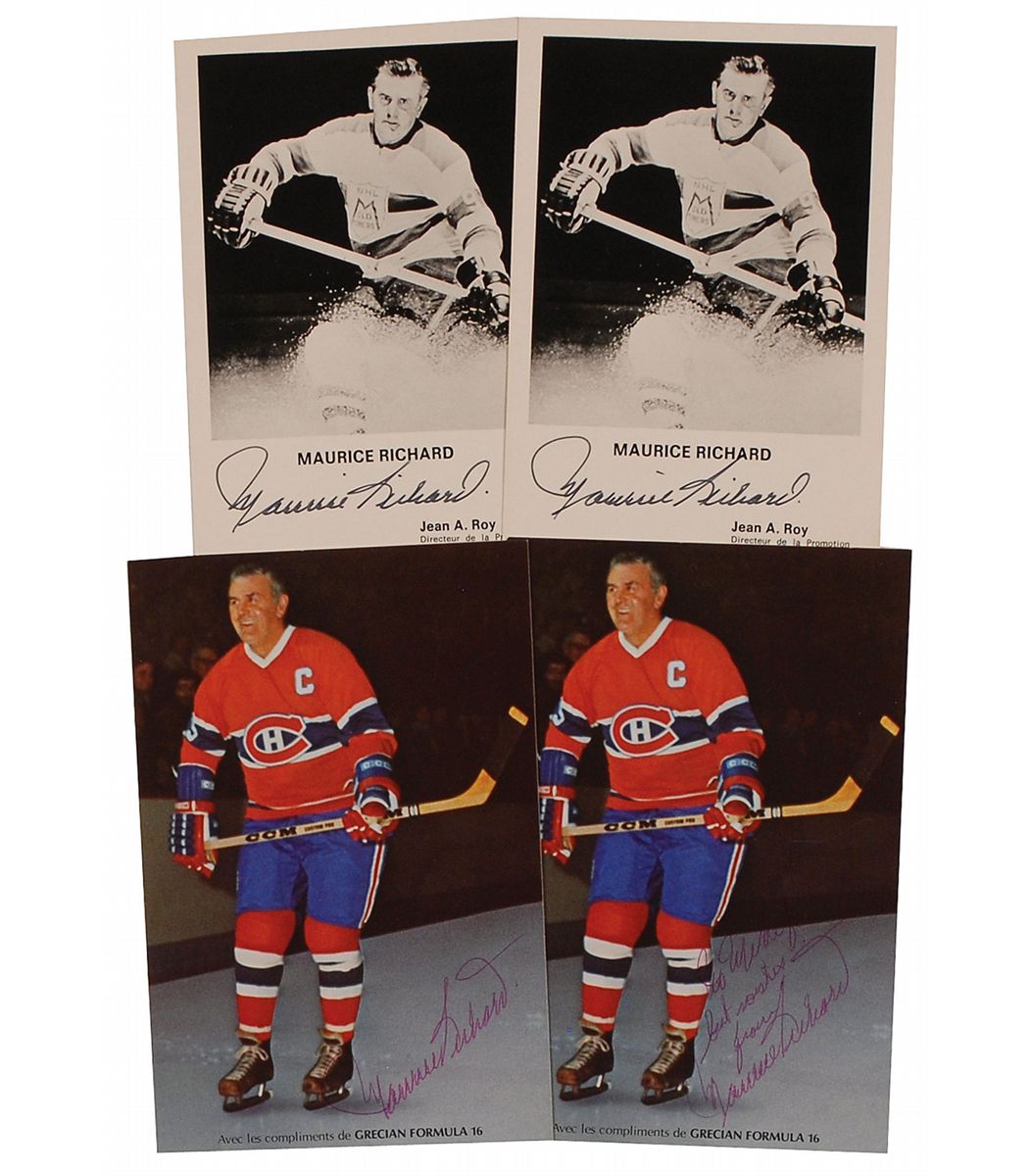 Four photos: two identical 3.75 x 5.5 cardstock publicity photos, each signed in the lower border in black felt tip; and two color 4 x 6 cardstock photos, each signed in red ballpoint (one inscribed). In overall fine condition.