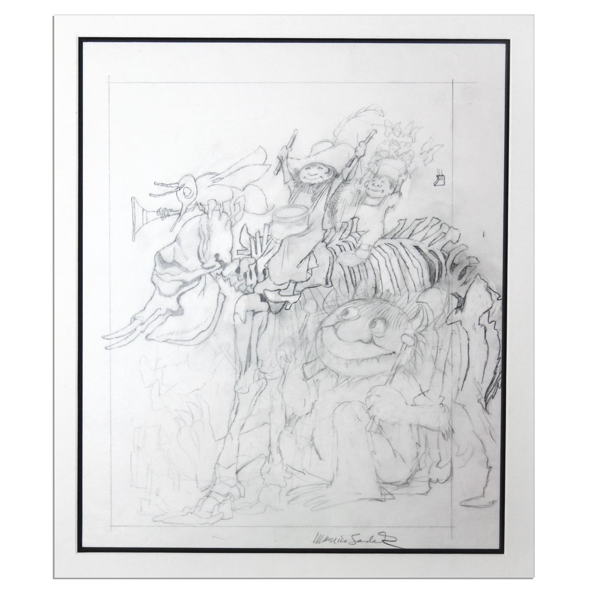 Maurice Sendak original pencil sketch of his ''Wild Things'' creations. The author of the 1963 children's book ''Where the Wild Things Are'' draws a captivating scene involving a dinosaur fossil and some Wild Things. He signs the lower right ''Maurice Sendak''. The story of a little boy's foray into an imaginary world of endearingly sensitive oversized creatures is one of the most popular children's stories of all time. Matted to an overall size of 17.5'' x 20'', visible area of drawing measures 12.25'' x 14.5''. Small .5'' tear to top edge at center, light smudging, and a smudge to mat bottom edge, else near fine.