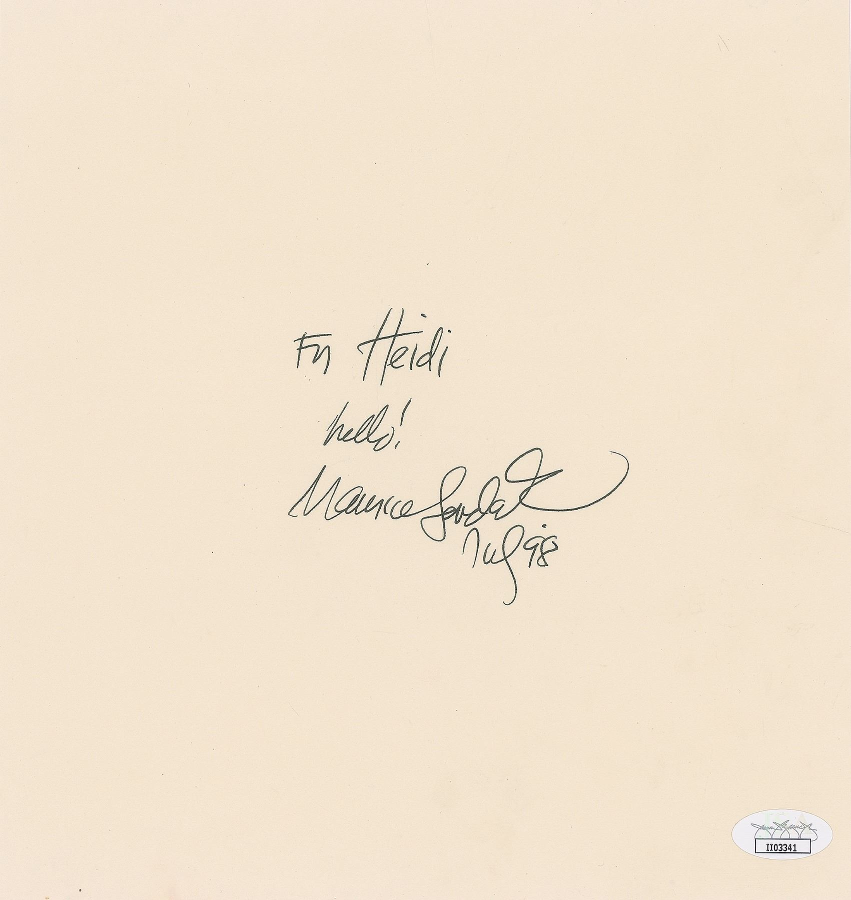 Ink signature and inscription, "For Heidi, hello! Maurice Sendak, July 98,” on an off-white 8.5 x 9 book page. In fine condition, with a JSA label affixed to lower right corner. Accompanied by a certificate of authenticity from JSA.