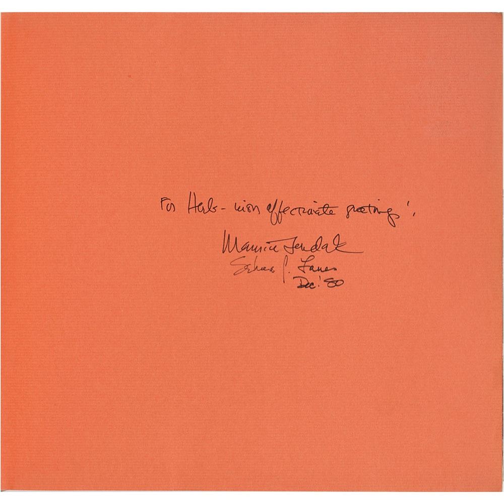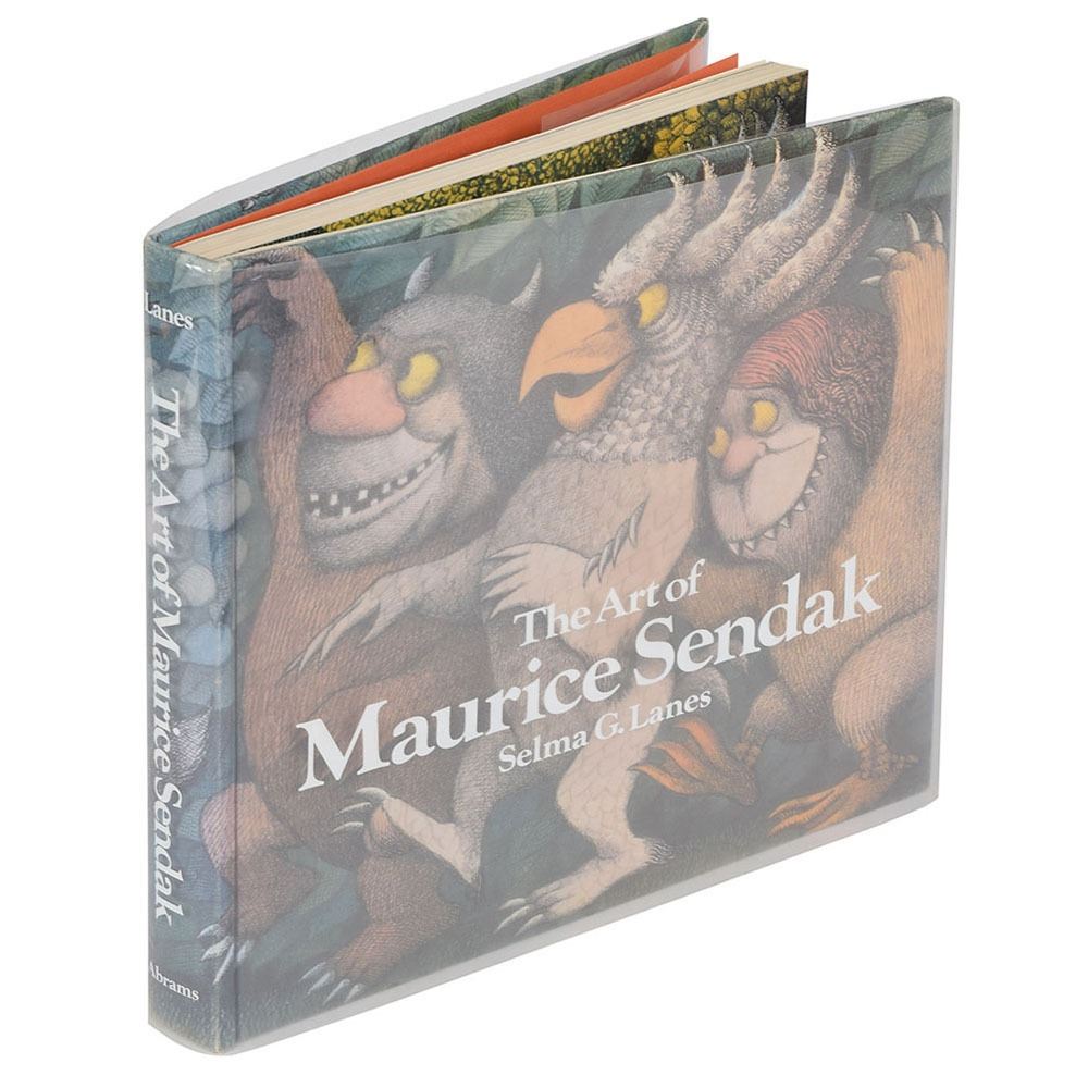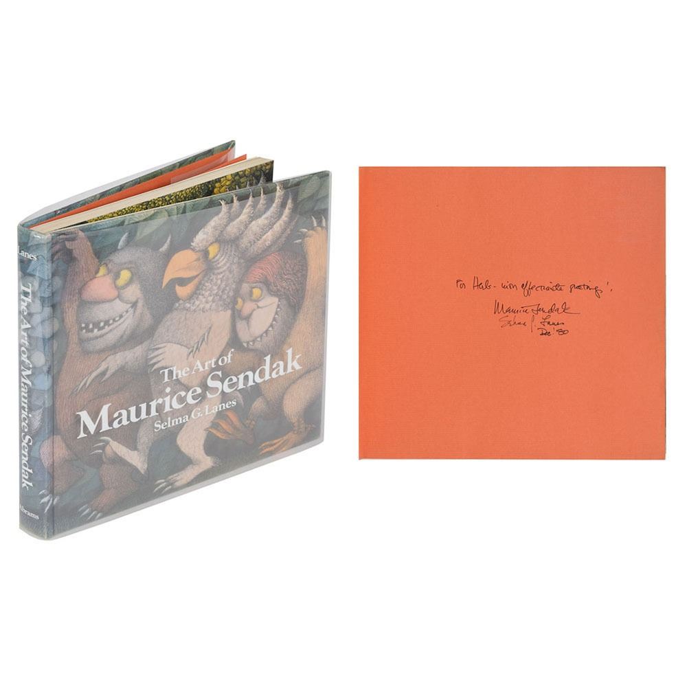 Signed book: The Art of Maurice Sendak. First edition. NY: Harry N. Abrams, 1980. Hardcover with lettered acetate dust jacket, 11.75 x 10.75, 278 pages. Signed and inscribed on the first free end page in black felt tip by the book's subject, "For Herb—with affectionate greetings! Maurice Sendak," and by its author, "Selma G. Lanes, Dec. '80." Autographic condition: fine. Book condition: VG+/VG.
