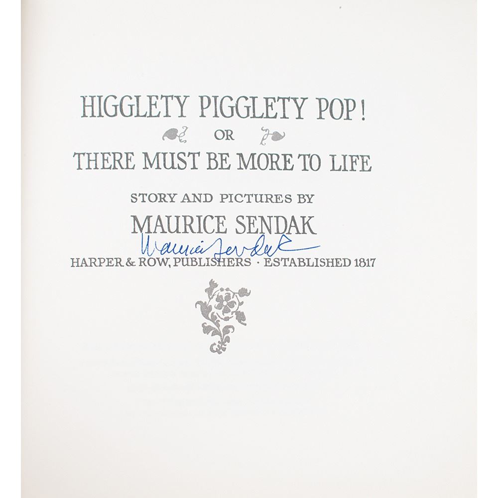 Signed book: Higglety Pigglety Pop! Or, There Must Be More to Life. First edition. NY: Harper & Row, 1967. Hardcover with dust jacket, 7 x 7, 69 pages. Signed on the title page in blue felt tip by Maurice Sendak. In fine condition, with a price-clipped dust jacket.