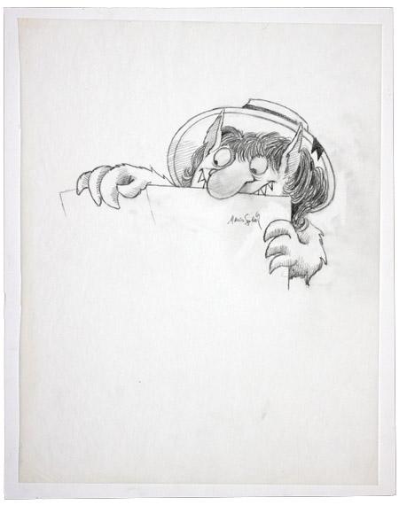 Maurice Sendak signed original sketch. An exceptional and rare piece from the author and illustrator of classic children's books, including ''Where the Wild Things Are'' and ''Into The Night Kitchen.'' Superb original pencil drawing executed on a sheet of tracing paper measuring 15'' x 19''. The drawing shows one of Sendak's iconic ''Wild Things'' wearing a ribboned wide-brimmed hat and devilishly peering over a book. Boldly signed beneath, ''Maurice Sendak.'' This drawing was created for an American Express advertising campaign in 1988. According to the volume ''Illustrated Shopping Bags Created by Maurice Sendak'' published by Left Bank Books, drawings such as this one were printed on shopping bags with the tagline: ''Purchase Protection. When monstrous accidents happen, the American Express Card has you covered.'' Not surprisingly, extant original bags are quite scarce. Fine condition.
