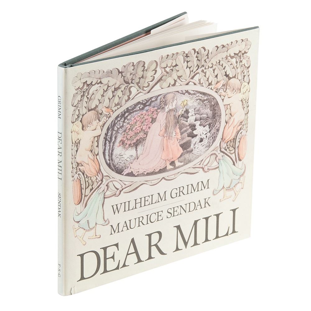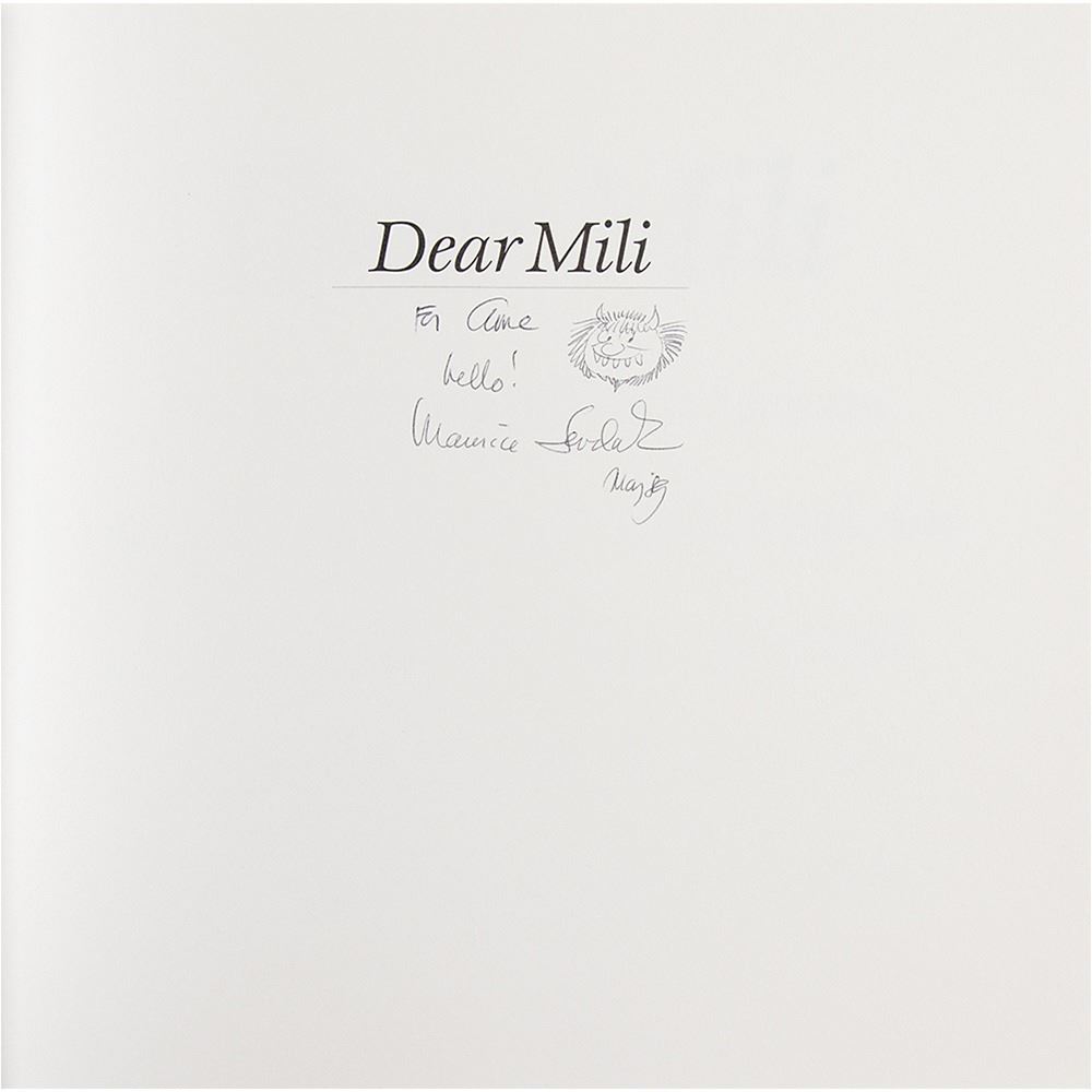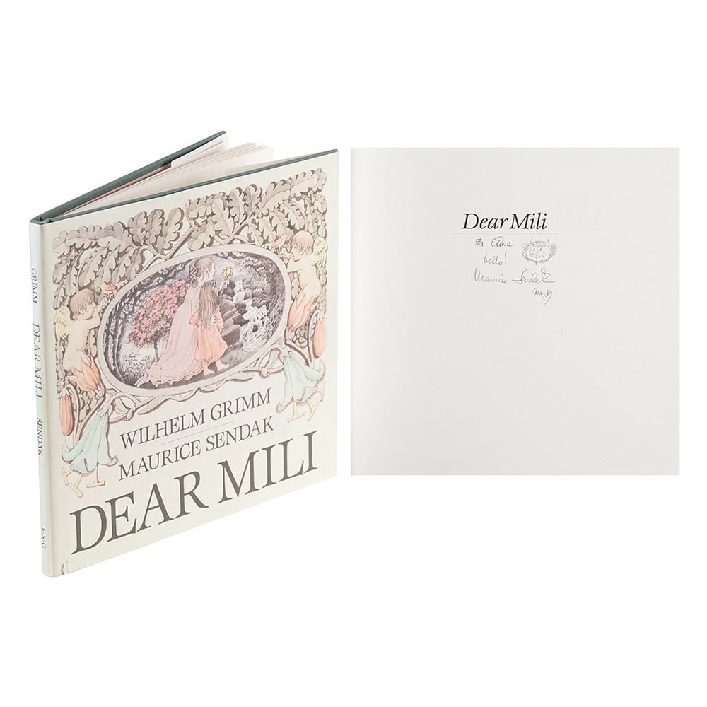 Signed book: Dear Milli. First edition. NY: Farrar, Straus and Giroux, 1988. Hardcover with dust jacket, 10 x 9.25. Signed and inscribed on the half-title page in black felt tip, "For Ame, hello! Maurice Sendak, May 89," adding a great sketch of Carol from Where the Wild Things Are, saying "Boo!" In fine to very fine condition, with a very short edge tear to the dust jacket.