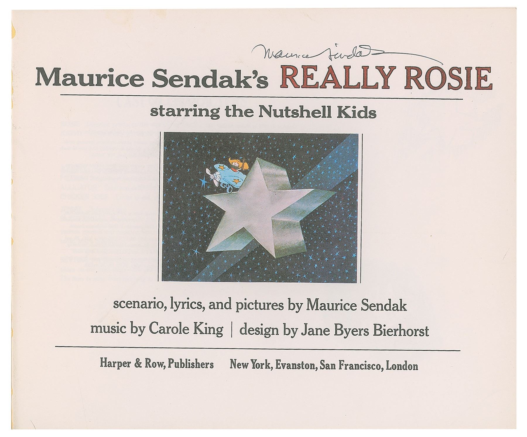 Signed book: Maurice Sendak's Really Rosie, starring the Nutshell Kids. First edition. NY: Harper & Row, 1975. Softcover, 10.75 x 8.75, 64 pages. Signed on the title page in black ballpoint, "Maurice Sendak." In fine condition.