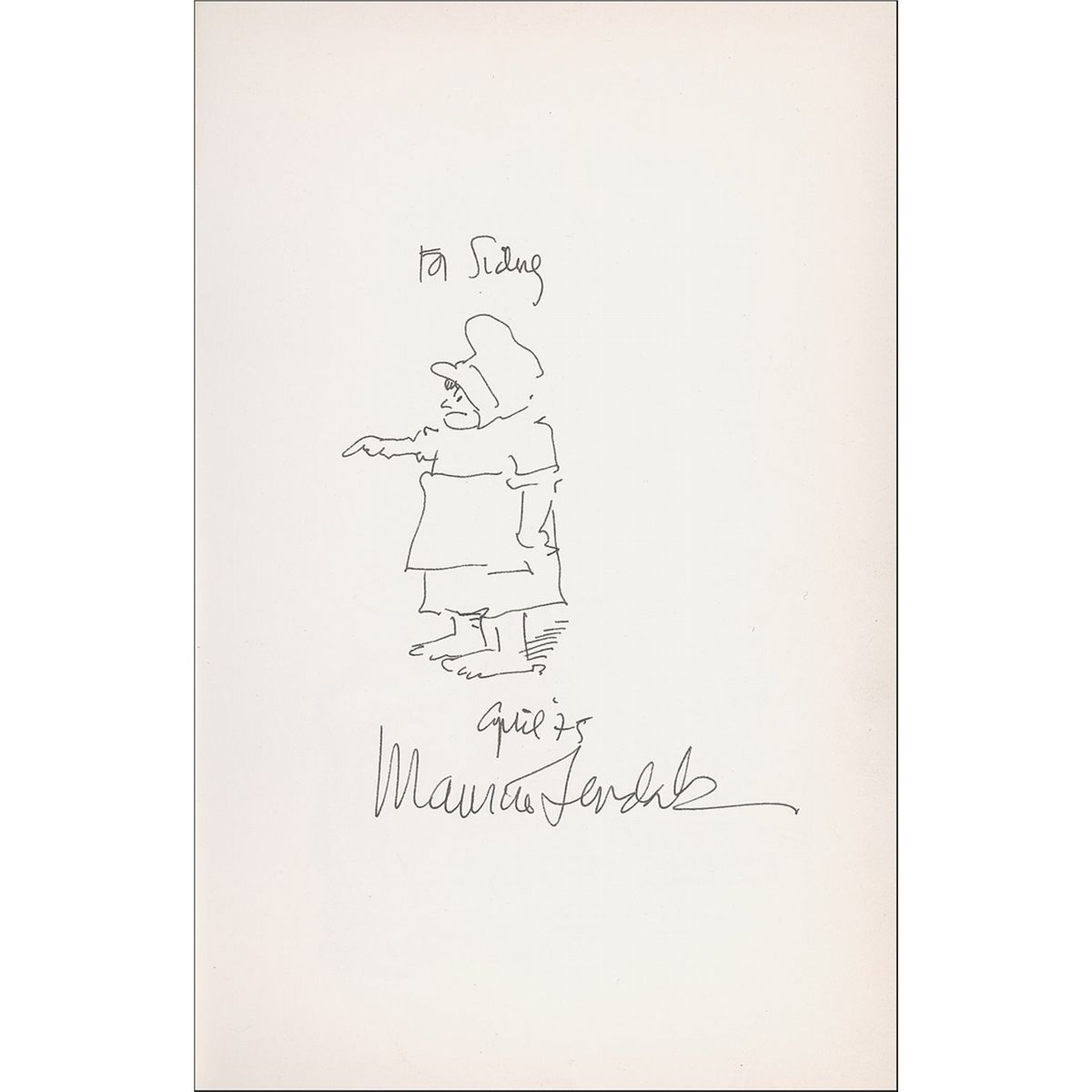Signed book: King Grisly-Beard. First edition. NY: Farrar, Straus, and Giroux, 1973. Hardcover, 6 x 9. Signed and inscribed on the first free end page, “To Sidney, April 75, Maurice Sendak,” adding a full-length sketch of one of the story’s characters. In fine condition. Any artwork from Sendak is quite uncommon.