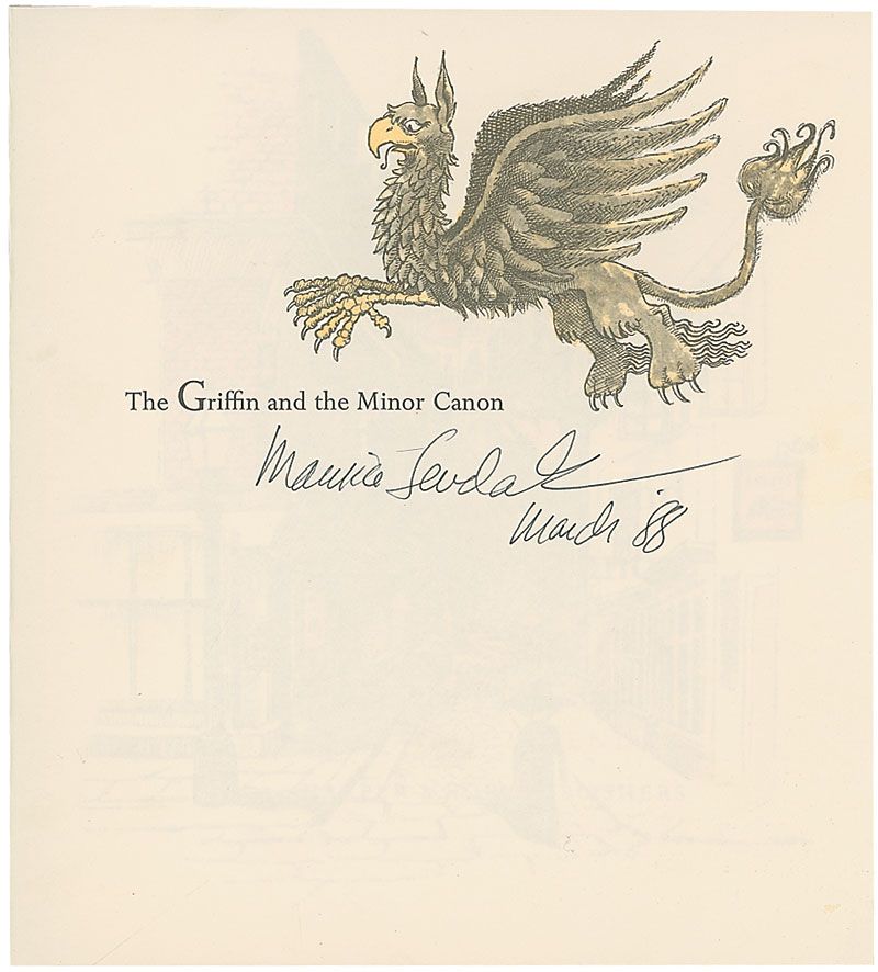 Signed book: The Griffith and the Minor Canon. Later printing. NY: Harper and Row, 1963. Hardcover with dustjacket, 7.75 x 8.25, 55 pages. Signed on the half-title page in black ballpoint, “Maurice Sendak March ‘88.” In fine condition, with clipped dustjacket.