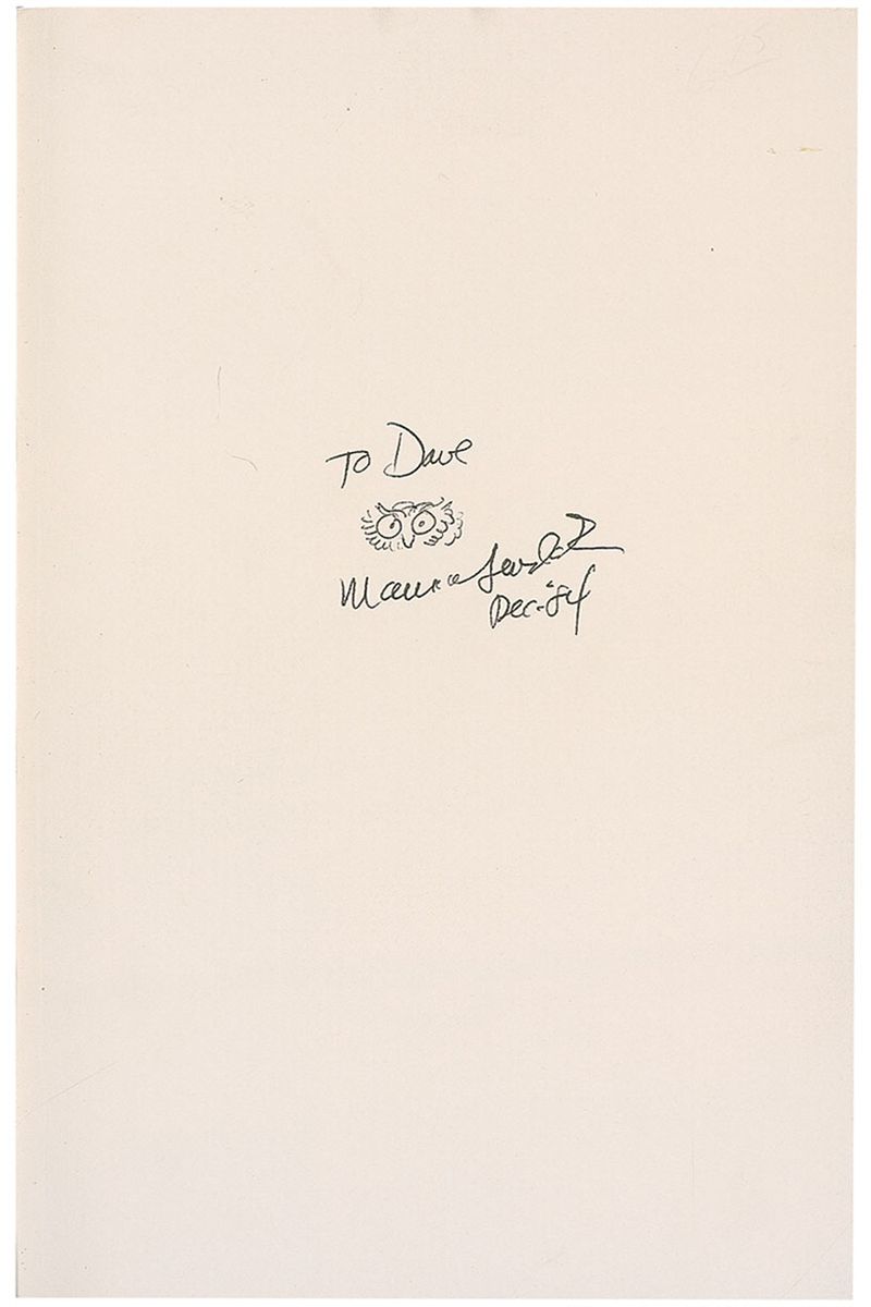Signed book: Fly by Night. First Edition. NY: Farrar, Strauss, and Giroux, 1976. Hardcover with dustjacket, 5.5 x 8, 30 pages. Signed and inscribed on the first free-end page, “To Dave, Maurice Sendak, Dec–84,” with Sendak adding a small sketch of an owl above his signature. In fine condition, with clipped dustjacket.