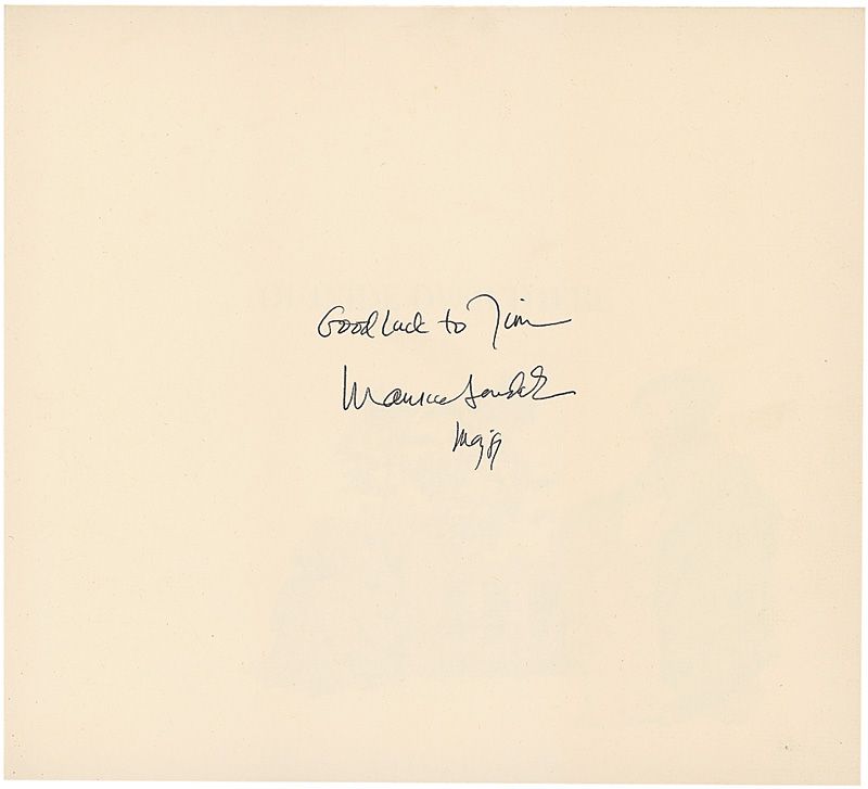 Signed book: Outside Over There. First edition. NY: Harper and Row, 1981. Hardcover with dustjacket, 10.25 x 9.25. Signed and inscribed on the first free-end page, “Good luck to Jim, Maurice Sendak, May 81.” In fine condition, with some scattered light wear to dustjacket.