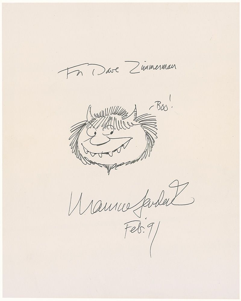 Original signed and inscribed ink sketch of a creature from Where the Wild Things Are, on an off-white 8 x 10 sheet, signed and inscribed “For Dave Zimmerman, Maurice Sendak, Feb. ‘91.” In fine condition, with scattered light creases.
