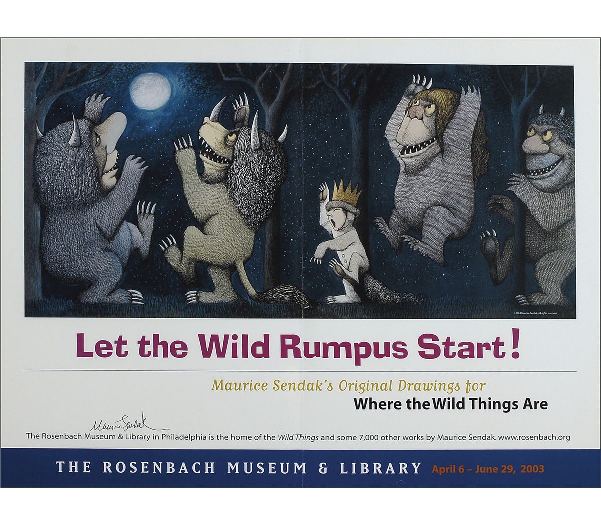 Popular author and illustrator (born 1928) of such children’s classics as Where the Wild Things Are and In the Night Kitchen. Color 24 x 18 poster for a 2003 exhibition of Sendak’s work for Where The Wild Things Are, signed in black ink. In fine condition, with a very heavy vertical crease where the item has been folded.