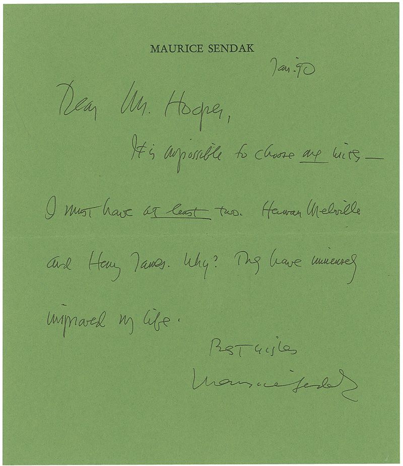 ALS, one page, 6 x 7, personal letterhead, January 1990. Letter to an admirer. In full: “It’s impossible to choose one writer. I must have at least two. Herman Melville and Henry James. Why? They have immensely improved my life.” In fine condition. Accompanied by the original mailing envelope.