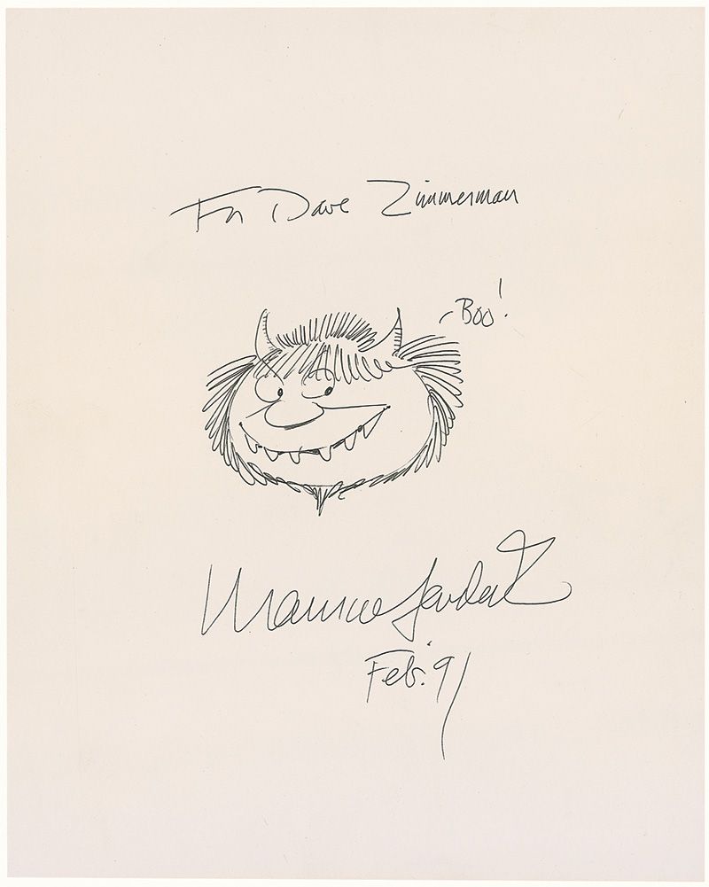 Original signed and inscribed ink sketch of a creature from Where the Wild Things Are, on an off-white 8 x 10 sheet, signed and inscribed “For Dave Zimmerman, Maurice Sendak, Feb. ‘91.” In fine condition, with scattered light creases.