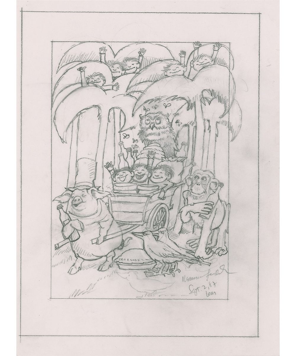 Original signed pencil sketch of an inebriated pig pulling a cart full of happy children, with an owl and a beehive on the back of the cart, a monkey walking alongside the cart, and several more children in the palm trees in the background on an off-white 9 x 12 sheet of tracing paper. In fine condition.