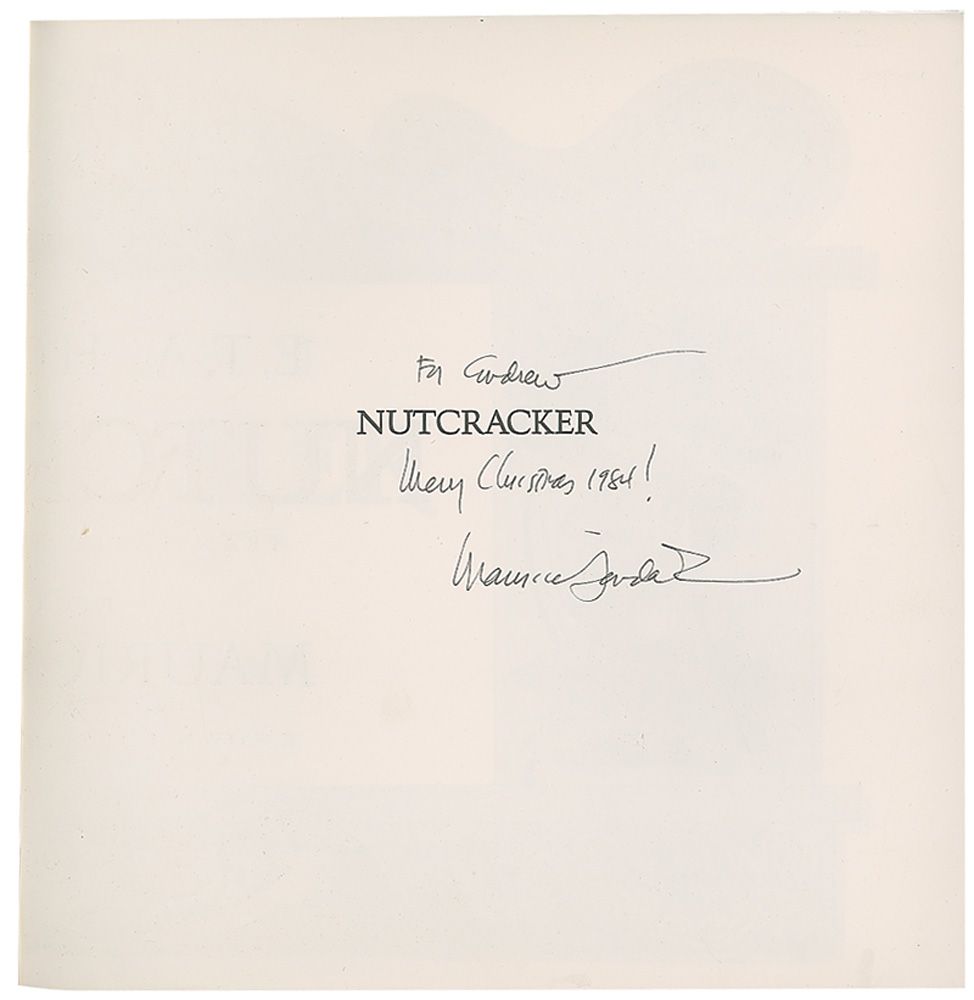 Signed book: Nutcracker. First edition. NY: Crown Publishers, 1984. Hardcover with dustjacket, 10.25 x 10.25, 102 pages. Signed and inscribed on the half-title page, “For Andrew, Merry Christmas 1984! Maurice Sendak.” In fine condition.