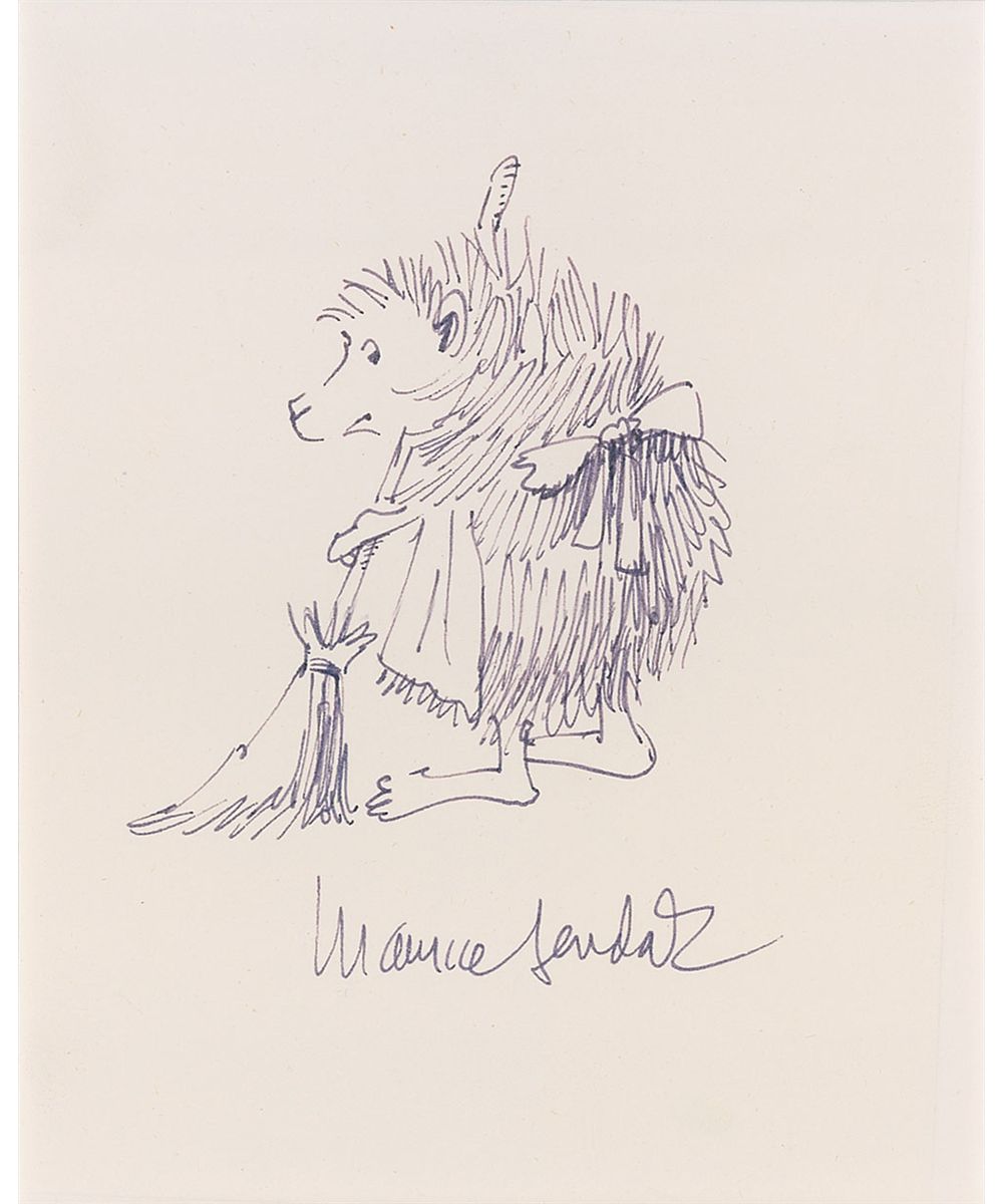Original signed ink sketch of a hedgehog sweeping on an off-white 4.5 x 7.5 sheet, signed under the image by Sendak. Matted to an overall size of 8 x 10. In fine condition.