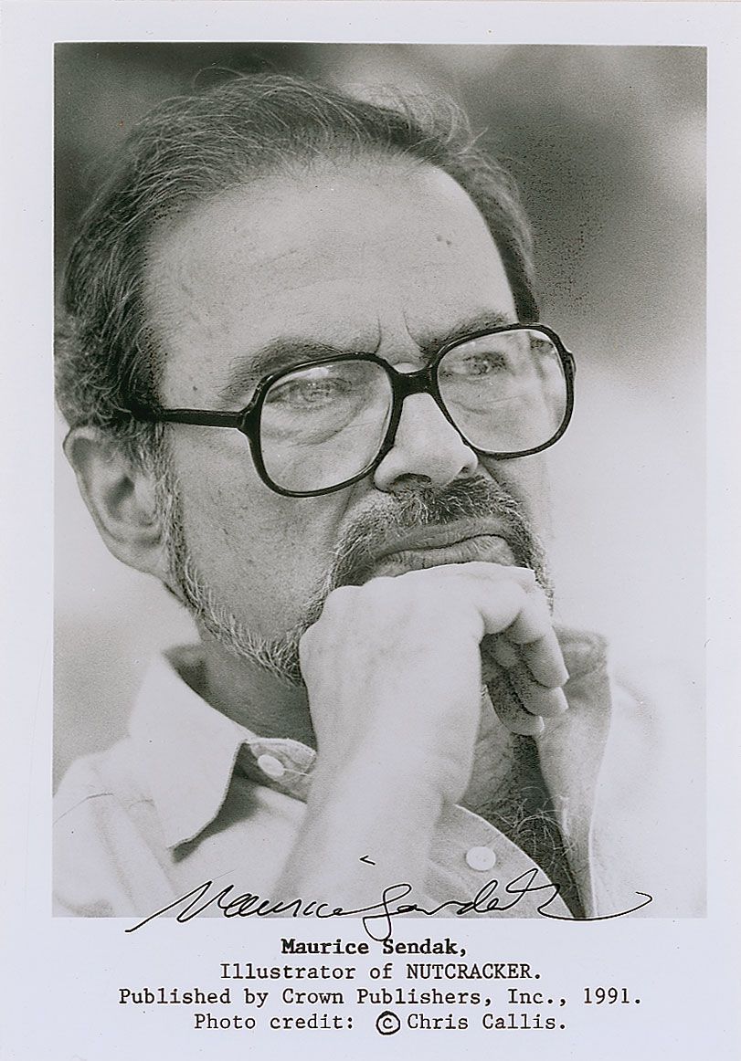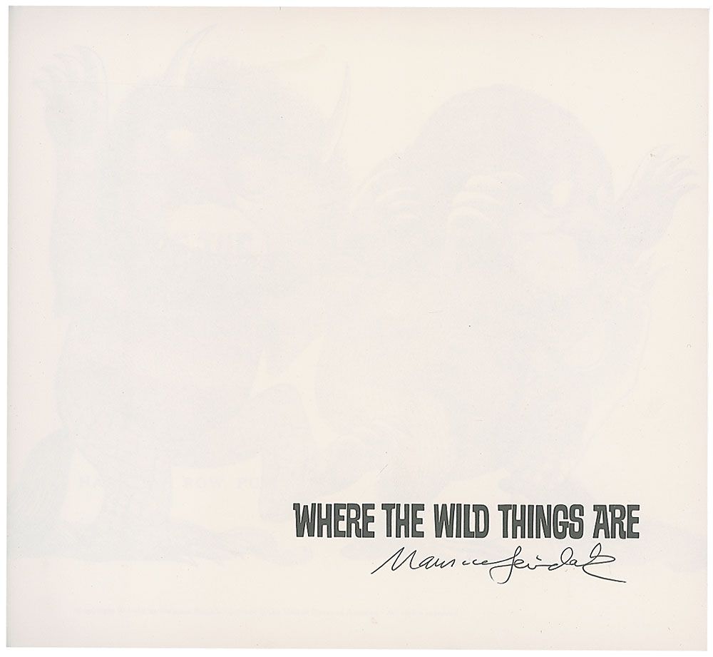 Signed book: Where the Wild Things Are. Later edition. NY: Harper and Row, 1963. Hardcover, 1 x 9.25. Signed on the half-title page in black ink. Autographic condition: fine. Book condition: VG+/None. Grey cloth-covered spine and illustrated paper-covered boards; minor wear to edges, with one rough bump to front upper corner; minor soiling to exterior. Accompanied by a glossy 5 x 7 publicity photo of Sendak, also signed in black ink.