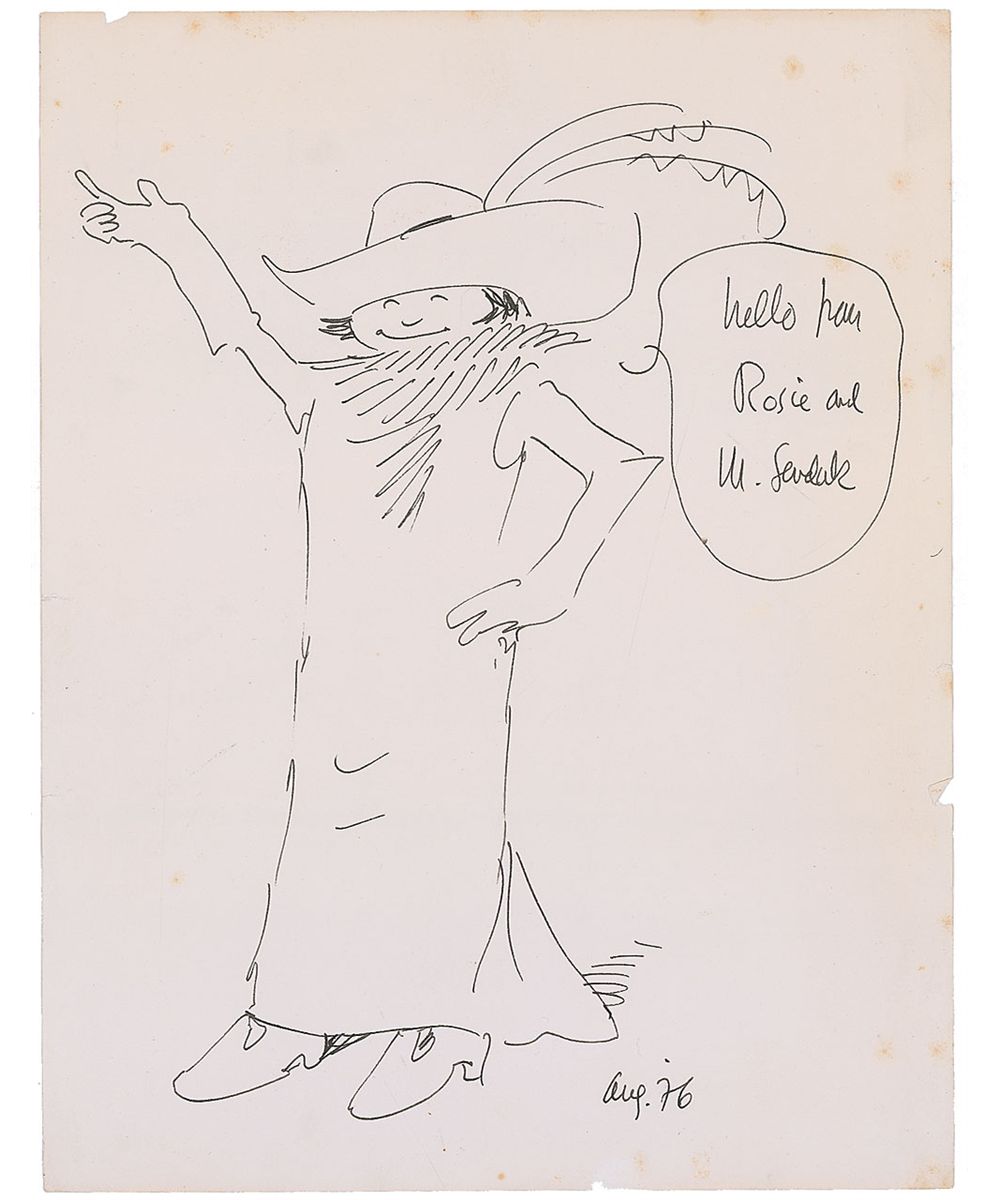 Original signed and inscribed full-length ink sketch of Rosie in a long dress, boa, and hat on an off-white 8.5 x 11 sheet, with a word balloon coming from Rosie which reads, “Hello Paul, Rosie and M. Sendak,” and dated at the bottom by Sendak, “Aug. 76.” In fine condition, with a couple small edge tears and creases and a bit of scattered mild foxing. The Sign on Rosie's Door was written in 1960, centered around an outgoing little girl who used to sing and dance on the stoop of her building. Sendak sketches—particularly those of his better-known characters, including Rosie—are uncommon and always desirable.