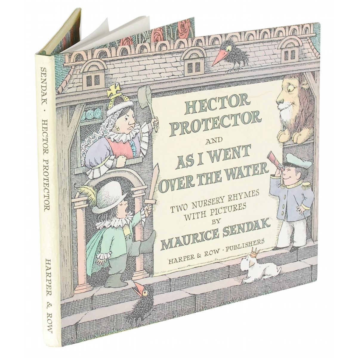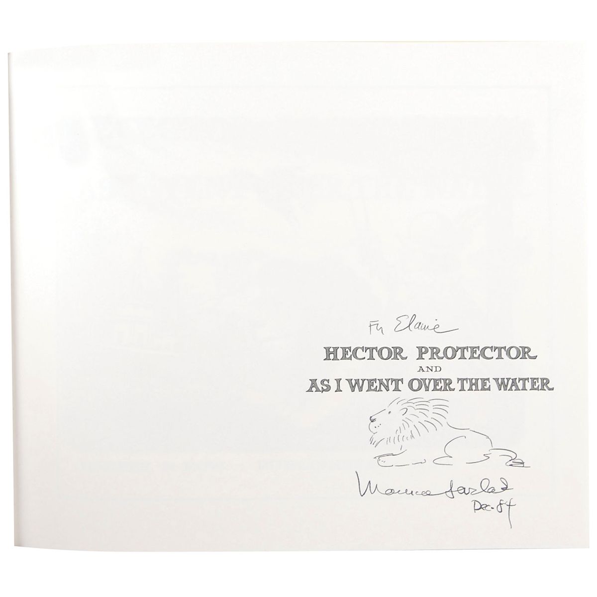 Signed book: Hector Protector and As I Went Over the Water. First edition. NY: Harper and Row, 1965. Hardcover with dust jacket, 8.5 x 7.5. Signed and inscribed on the half-title page, “For Elaine, Maurice Sendak, Dec 84,” with Sendak adding a full-length sketch of a seated lion. Autographic condition: very fine. Book condition: NF/VG+.