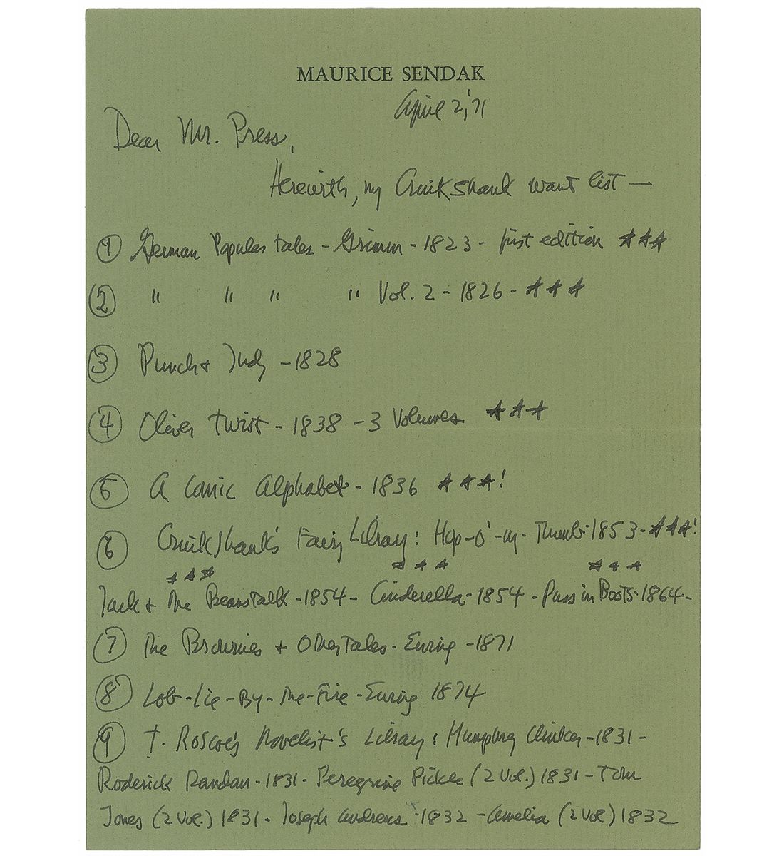 ALS, one page both sides, 5 x 7, personal letterhead, April 2, 1971. Letter regarding his collection of books illustrated by George Cruikshank. In part: “Herewith, my Cruikshank want list—1. German Popular Tales-Grimm-1823-First edition***…4. Oliver Twist-1838-3 volumes***…5. A Comic Alphabet-1836***!…6. Cruikshank’s Fairy Library: Hop-o’-My-Thumb-1853***!, Jack & the Beanstalk***-1854-Cinderella***-1854-Puss in Boots***-1864…The above should (hopefully!) be in good, really good condition & in original binding…The really important ones are starred. You are very kind to do this for me—& I will someday come up & see you & the library—sounds terrific!…P. S. The Comic Alphabet & Complete Fairy Library in original parts are most important.” In fine condition. Cruikshank was one of Sendak’s earliest and strongest influences as an artist—Sendak once said that when he was young he first encountered Cruikshank’s work in Grimm’s Fairy Tales and began to copy the crosshatching style in his own drawings. Sendak was also an avid collector of the things he loved—he owned a presentation copy of Herman Melville’s Moby Dick, dozens of engravings by William Blake, and one of the largest Mickey Mouse collections in the world. With content concerning Sendak’s closest artistic influence and his own personal interests, this is a wonderful letter.