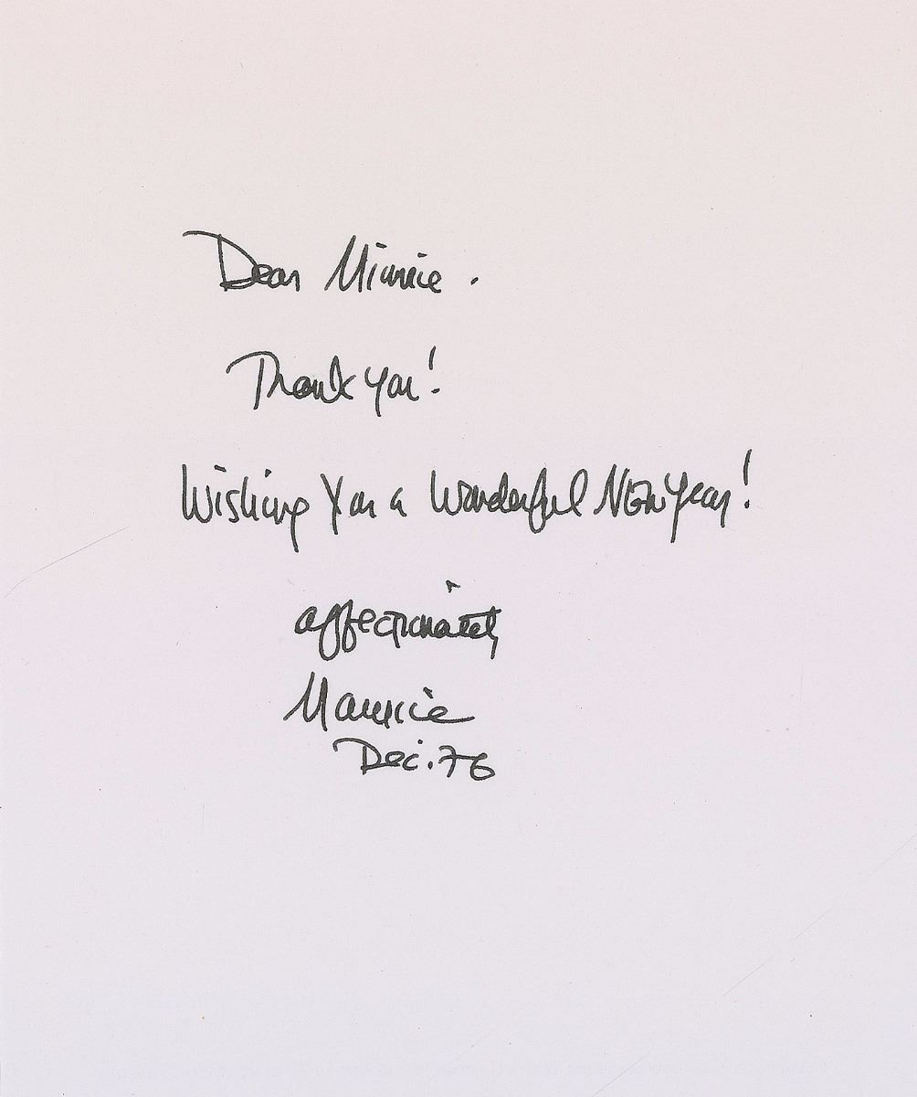 New Year’s card depicting Sendak’s Where the Wild Things Are artwork designed for the cover of Rolling Stone, 4.75 x 5.75, signed and inscribed inside in black felt tip, “Dear Minnie, Thank you! Wishing you a wonderful New Year! Affectionately, Maurice, Dec. 76.” In fine condition.