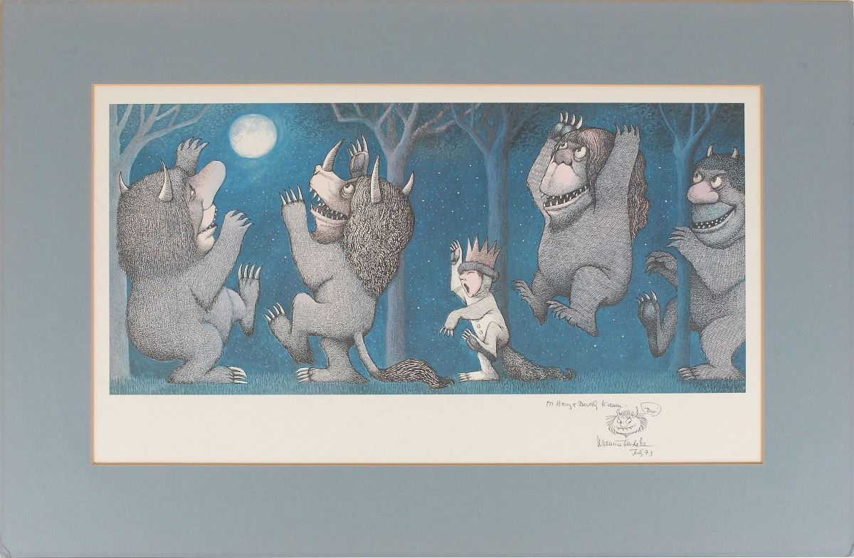 Scarce color 21.25 x 12 print from the 1963 book Where the Wild Things Are, depicting Max and four beasts performing a full moon rumpus, signed and inscribed in the lower border in black ballpoint, “For Harry & Beverly Kanen, Maurice Sendak, July ‘73,” adding a small sketch of Carol saying “Boo!” Matted and in fine condition, with light wrinkling from being mounted to a heavier sheet. A simply fantastic and beautifully rendered print of one of the book’s most treasured moments.