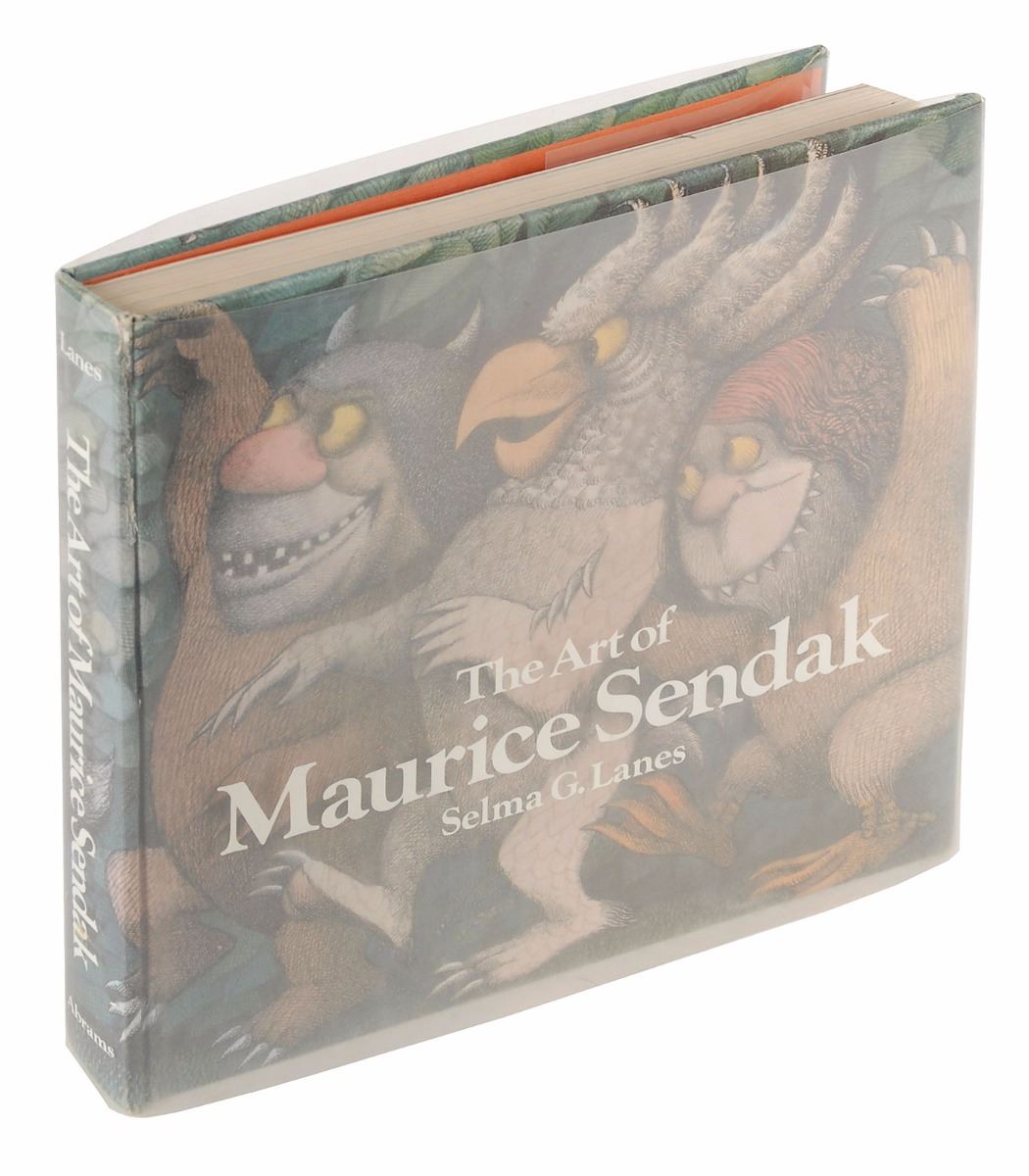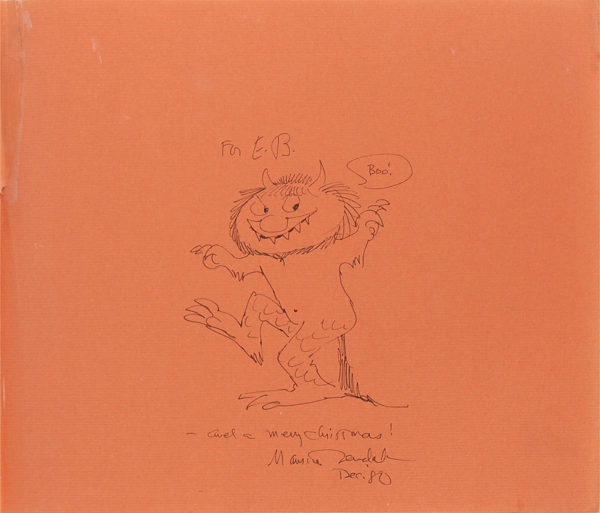 Signed book: The Art of Maurice Sendak. First edition. NY: Harry N. Abrams, 1980. Hardcover with lettered acetate dust jacket, 11.75 x 10.75, 278 pages. Signed and inscribed on the first free end page in black felt tip, “For E. B.—and a merry Christmas! Maurice Sendak, Dec. 80,” with the addition of a large original full-body sketch of one of his famous Wild Thing Carol saying, “Boo!” In fine condition, with tears to the hinge and left side of the signed page, far from the wonderful sketch.