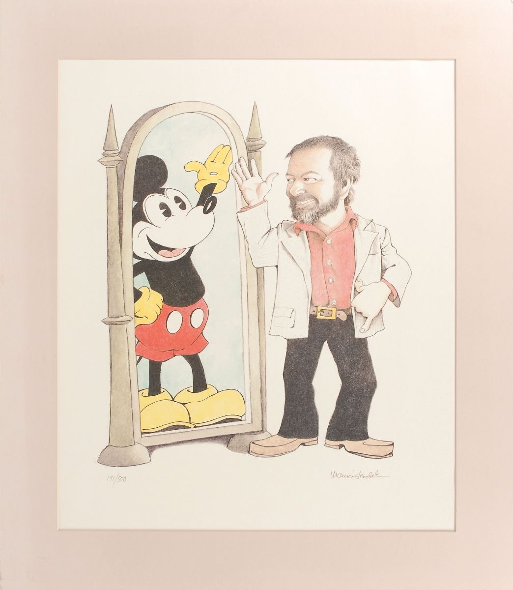 Fantastic color limited edition 17 x 20 print of Maurice Sendak waving hello to a reflection of Mickey Mouse in a mirror, entitled ‘Mickey and Me,’ numbered 191/500, signed in black ink. Matted and in fine condition. Issued on occasion of the opening of a Sendak exhibition at the Rosenbach Library in 1978.