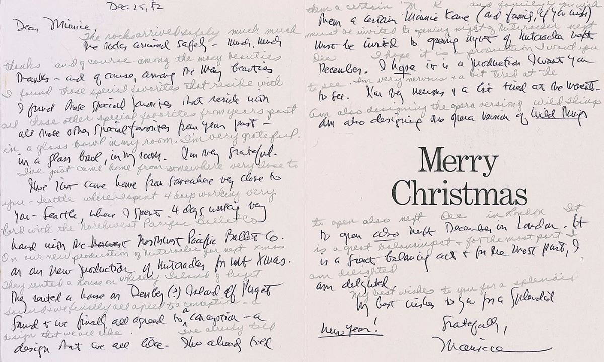 ALS signed “Maurice,” two pages inside a card featuring Where the Wild Things Are artwork, 4.75 x 5.75, no date. In part: “I’ve just come home from somewhere very close to you—Seattle, where I spent 4 days working very hard with the Northwest Pacific Ballet Co. on our new production of Nutcracker for next Xmas…we finally all agreed to a conception—a design that we all like…Am also designing the opera version of Wild Things to open also next December in London. It is a great balancing act & for the most part, I’m delighted.” Each line is transcribed in pencil above in another hand. In fine condition.