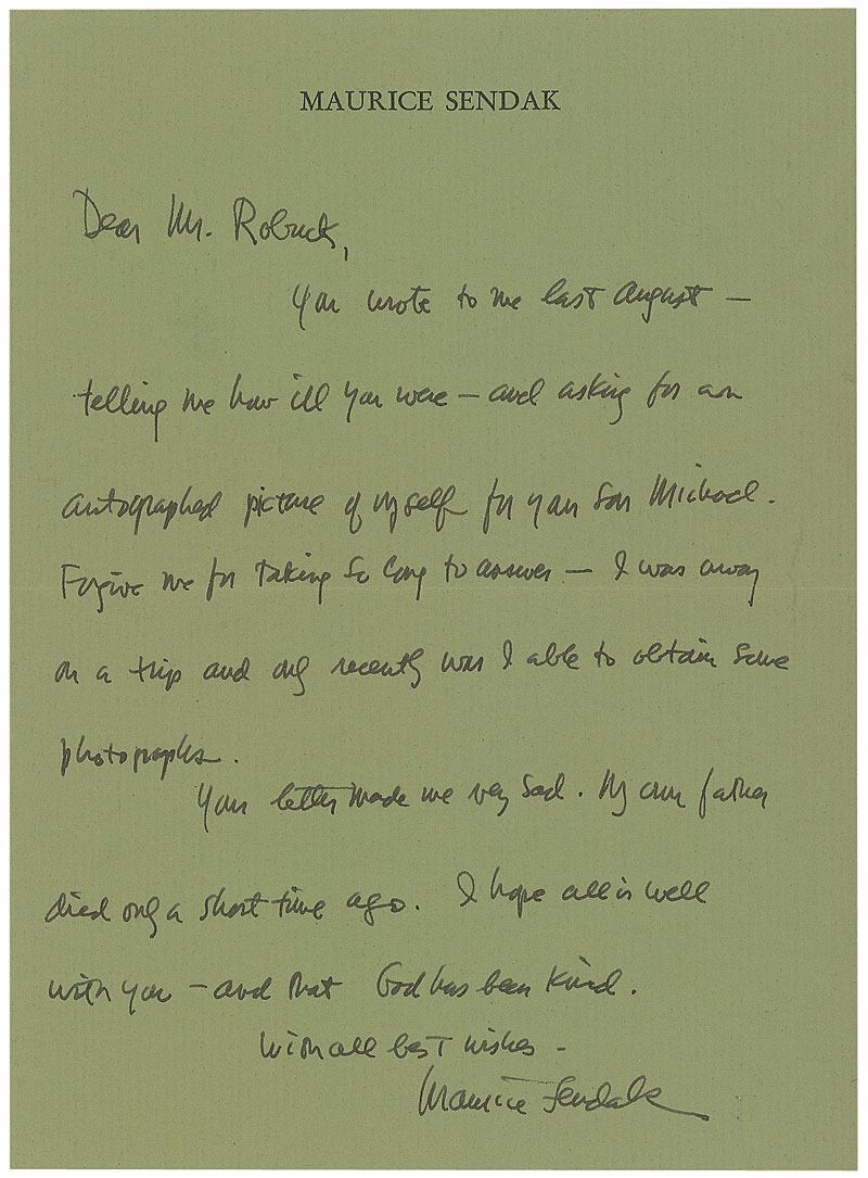ALS, one page, 5 x 7, personal letterhead, January 19, 1972. Response to an autograph request. In full: “You wrote to me last August—telling me how sick you were—and asking for an autographed picture of myself for your son Michael. Forgive me for taking so long—I was away on a trip and only recently was I able to obtain some photographs. Your letter made me very sad. My own father died only a short time ago. I hope all is well with you—and that God has been kind.” In fine condition. Accompanied by the original mailing envelope addressed in Sendak’s hand, including a signature in the return address area. Pre-certified PSA/DNA.